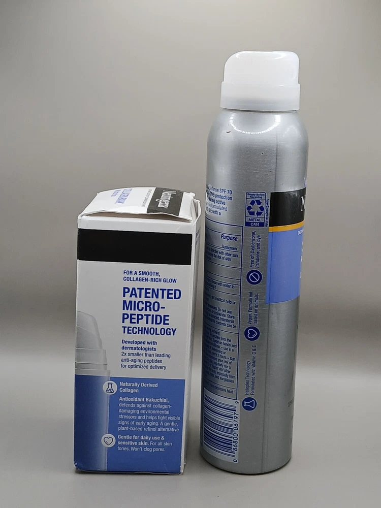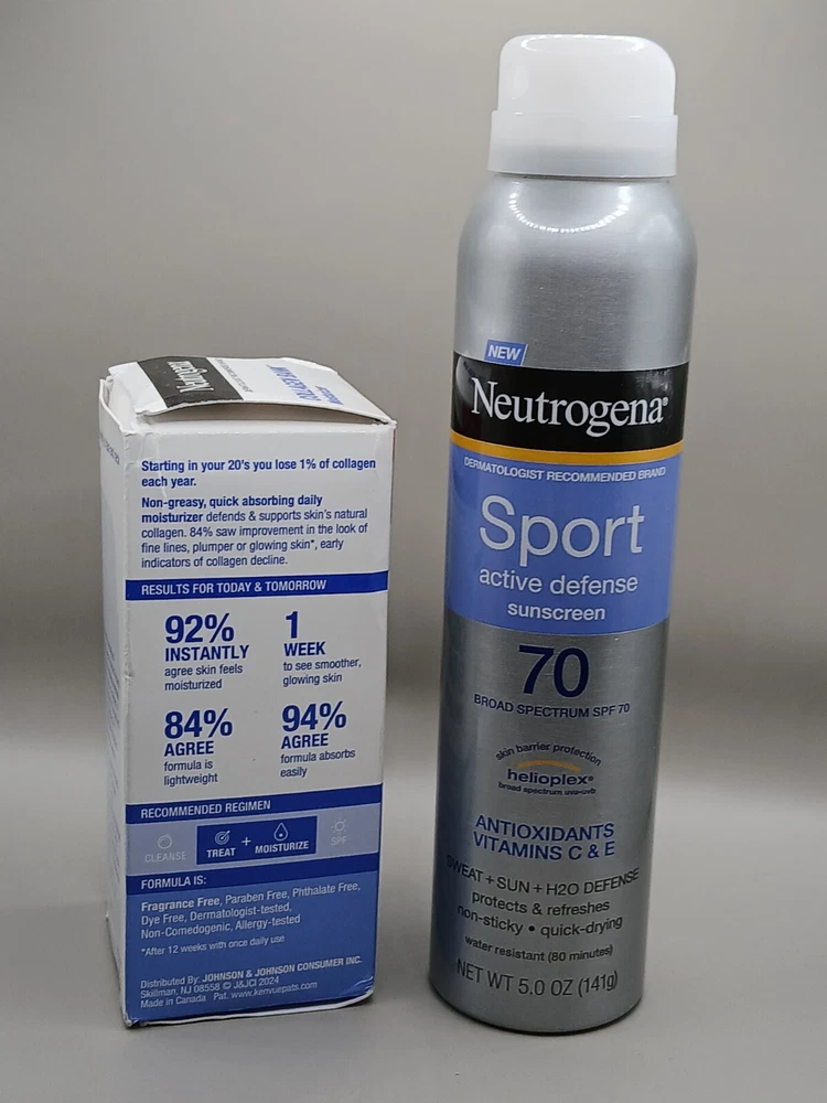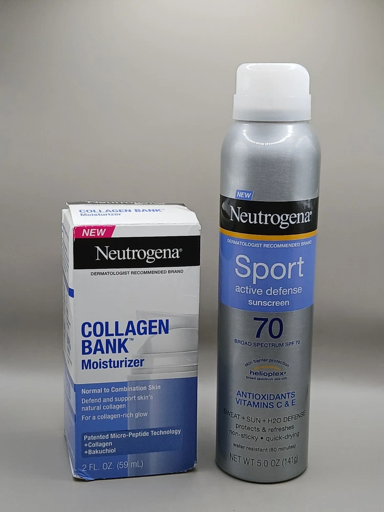 Holiday Bundle Offer with Great Price Product One Description :- Neutrogena Collagen Bank Moisturizer 2 fl. oz | Bakuchiol, Glow & Plump Skin (NEW) is a skincare product designed to boost skin's natural collagen production while promoting a glowing, plump complexion. Here are the key features and benefits of this product: Key Features: Collagen Boosting : Formulated with ingredients that help support the skin's natural collagen production, enhancing skin firmness and reducing the appearance of fine lines and wrinkles. Bakuchiol : Contains bakuchiol , a plant-based alternative to retinol, which helps improve skin texture, reduce signs of aging, and provide gentle rejuvenation without irritation. Glow & Plump : This moisturizer works to hydrate and plump the skin, giving it a radiant, youthful glow. Suitable for All Skin Types : The lightweight, non-greasy formula is ideal for daily use on all skin types, including sensitive skin. 2 fl. oz Size : This size offers a convenient amount for regular use, providing long-lasting results. Benefits: Boosts collagen production for firmer, more youthful-looking skin. Reduces the appearance of fine lines and wrinkles. Provides hydration and a healthy glow. Gently rejuvenates skin with bakuchiol, suitable for sensitive skin. Usage: Apply a generous amount to clean, dry skin, massaging gently in an upward motion. Use daily, both morning and night, for best results. For enhanced results, use alongside a sunscreen during the day, as consistent use of moisturizers that stimulate collagen can make skin more sensitive to sun exposure. Product Two Description :- Neutrogena Sport Active Defense SPF 70 Sunscreen Spray with Helioplex (5oz) is a high-performance sunscreen designed to provide broad-spectrum protection against sun damage during outdoor activities. Here are the key features and benefits of this product: Key Features: High SPF 70 Protection : Provides broad-spectrum protection against both UVA and UVB rays, helping to prevent sunburn and long-term skin damage. Helioplex Technology : Uses Helioplex , a stable sunscreen technology that enhances UVA protection for long-lasting defense. Sport-Ready : Specifically formulated for active use, this sunscreen is designed to be sweat-resistant and water-resistant for up to 80 minutes, making it ideal for sports and outdoor activities. Quick-Drying & Non-Greasy : The spray formula is lightweight, fast-absorbing, and non-greasy, offering a comfortable finish. 5oz Size : Convenient, travel-friendly size for easy application on the go. Benefits: Provides high-level sun protection for active lifestyles. Sweat- and water-resistant for outdoor activities. Quick-drying and non-greasy formula for ease of use. Convenient spray format for easy, even application. Usage: Shake well before use. Spray generously and evenly on exposed skin 15 minutes before sun exposure. Reapply at least every 2 hours, or after swimming, sweating, or towel drying. For best results, use in combination with other sun protection methods like wearing protective clothing and seeking shade.