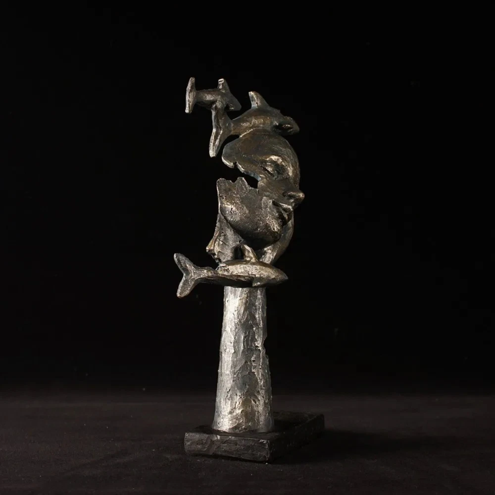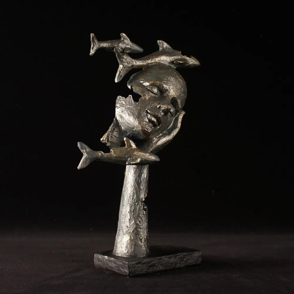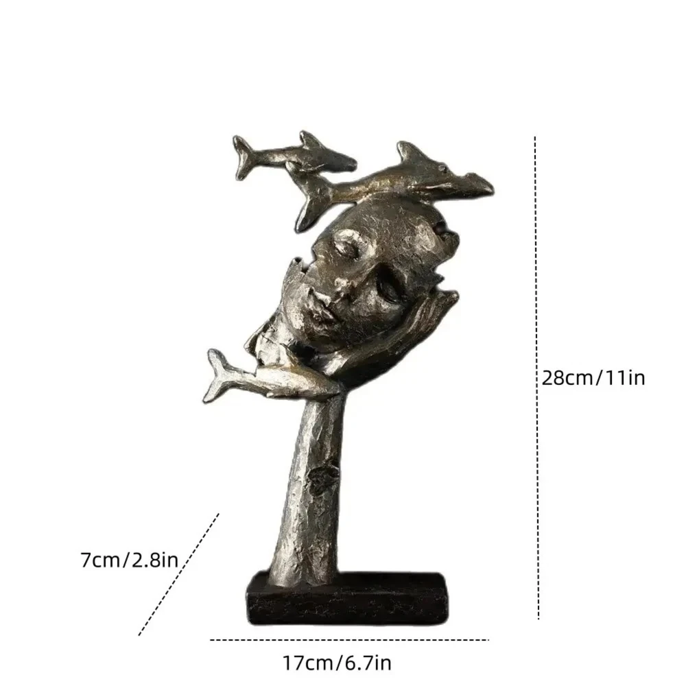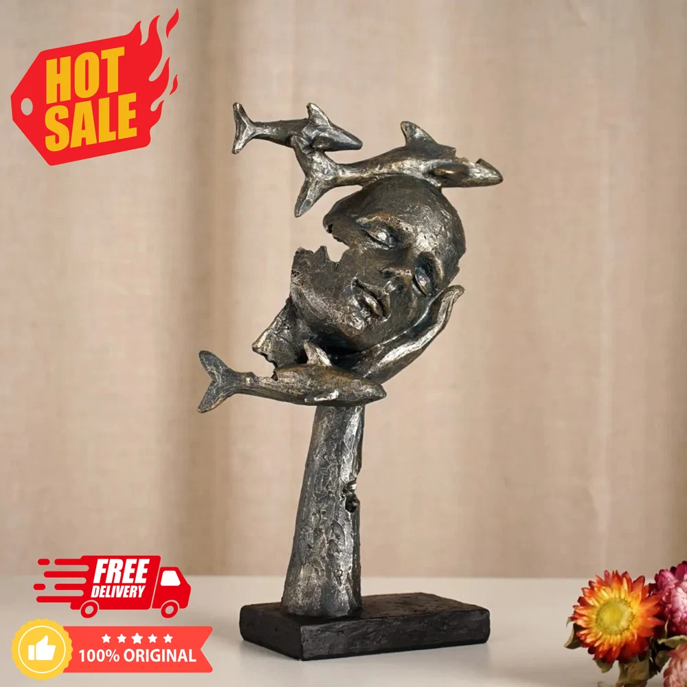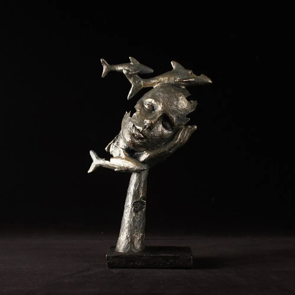 HomeNew 11” Female Face Sculpture with Fishes Resin Abstract Human Art Deco Statue