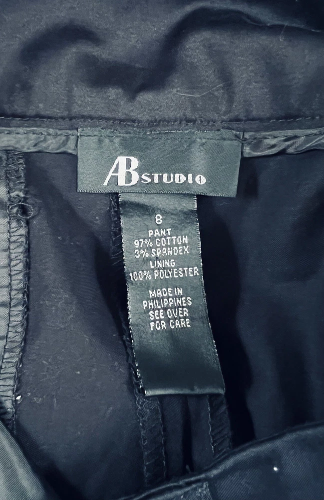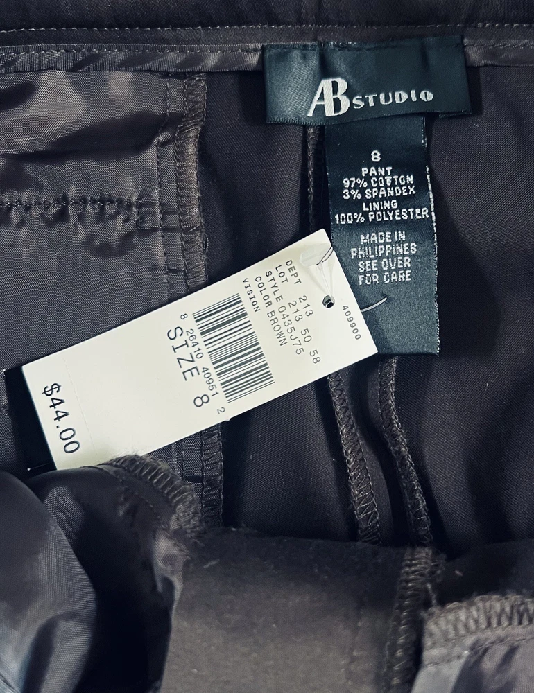 New 2 Pair AB Studio Vision Stretch Carpi Pants Women's Size 8 Black & Brown Please note brown pants are NWT and black pants are NWOT. Black: Waist: 16.75 Inseam: 23.25 Length down outside of leg: 33.25 (may subtract inseam length from leg length to get approximate rise measurement) Brown: Waist: 16.75 Inseam: 22.75 Length down outside of leg: 33.25 All measurements are approximate, (inches) and taken while the garment is laying flat and not stretched. All measurements are meant as a guide only. Will combine shipping. My home is smoke and pet free, but items may have come from homes that had smokers/pets. I launder all clothing that is not new before listing. Please review item description, condition and photos before purchasing. I do my best to be as descriptive and accurate as possible. Please ask questions before purchasing. If you need to change your shipping address, do so before purchasing. I can only ship to the address designated on your account. Please note colors may differ due to monitor settings. Please note all listings have a three day handling time. Do not purchase this listing if that does not work for you. I only ship USPS. Please remember the seller does not control the post office/deliveries, especially around the holidays. Most items, (clothing, plush, ect...) will be mailed in a water resistant poly mailer. Hats/caps will be mailed boxed to avoid crushing, (unless designed as packable). Any breakables will be carefully packaged in a sturdy box with several layers of bubble wrap and/or packing paper. I recycle clean packing products to reduce waste when available.
