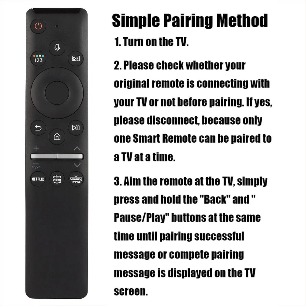Product Description If you have any questions, please contact customer service first, do not open disputes easily, thank you! Specification: Model Number: BN59-01329A BN59-01330A Condition: New Compatible Brand: For Samsung Type:TV Remote Channel: 1 Frequency: 433 MHz Material: ABS Material Colour: As Shown Mode power supply: 2xAA batteries (batteries are not included) Remark: A replacement remote control units and will work as well as the originals. Compatible for Samsung TV model: QN49Q80TAFXZA, QN49Q8DTAFXZA, QN50Q80TAFXZA, QN55Q70TAFXZA, QN55Q80TAFXZA, QN55Q8DTAFXZA, QN55Q90TAFXZA, QN65Q70TAFXZA, QN65Q7DTAFXZA, QN65Q800TAFXZA, QN65Q80TAFXZA, QN65Q8DTAFXZA, QN65Q900TSFXZA, QN65Q90TAFXZA, QN75Q70TAFXZA, QN75Q800TAFXZA, QN75Q80TAFXZA, QN75Q8DTAFXZA, QN75Q900TSFXZA, QN75Q90TAFXZA, QN82Q70TAFXZA, QN82Q800TAFXZA, QN85Q70TAFXZA, QN85Q80TAFXZA, QN85Q900TSFXZA, QN85Q90TAFXZA Pairing: The remote control needs to be paired before use. To pair the remote control: Press the BACK and START / PAUSE buttons at the same time, for five seconds to pair the remote control with your TV. Warm Reminder: Without pairing, your remote might work directly, but the response will be slower, so we recommend pairing it before use. Package Included: 1 x Remote control (batteries are not included) Note: Due to different lighting and screen settings, the item color may be slightly different from the picture. Due to different manual measurements, please allow a 1-2cm difference in size. About Us We accept all payments authorized by eBay. powered by