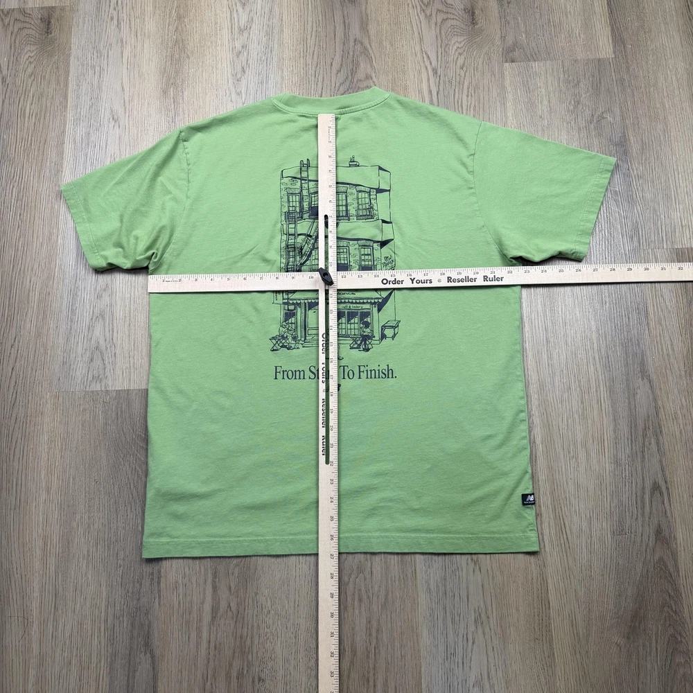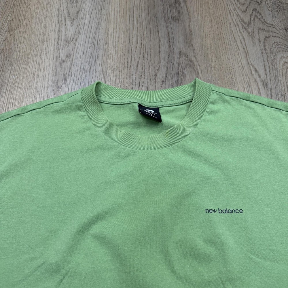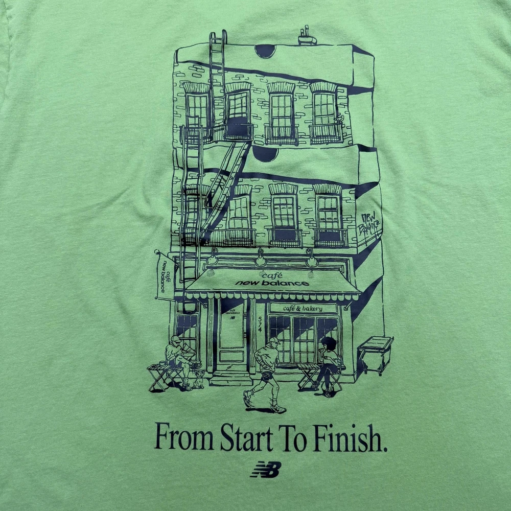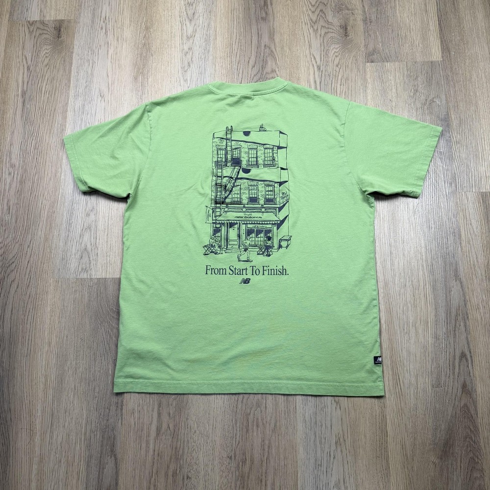 Brand: New Balance Style: Mens short sleeve crewneck graphic T-shirt with small front logo and large illustrated back print. Color: Light green knit fabric with dark green printed artwork and branding. Size: Mens Large (L) per woven neck label. Material: Fabric content and care information are listed on the interior care tag; specific fiber content is not fully visible in the photos. Details: Minimal front "new balance" text at left chest, large back building illustration featuring a "café new balance" storefront with café & bakery signage and "From Start To Finish." slogan with NB logo, ribbed crew neckline, short sleeves, straight hem, soft jersey knit construction, regular fit suitable for all-season casual streetwear or athletic-inspired wear. Label info: Black woven neck label with New Balance logo and text reading "new balance since 1906 L made in China," small woven NB logo tab at the left hem, and interior care label with multi-language care instructions. Special notes: There is a small open seam/hole at the lower side hem and a faint small mark on the front; refer to photos for close-ups. Garment is stored folded in a protective poly bag as shown.