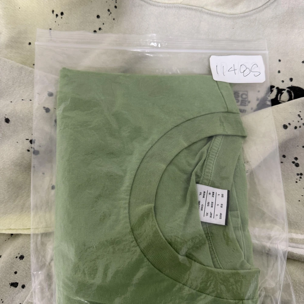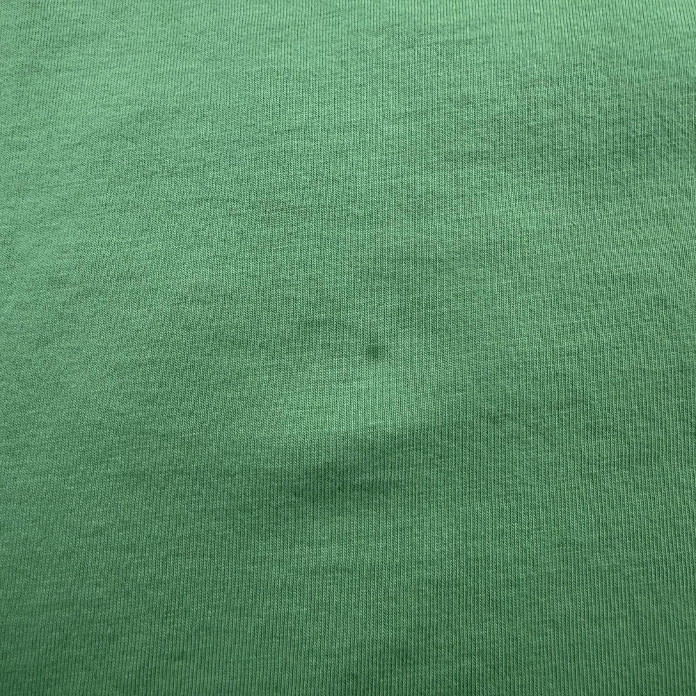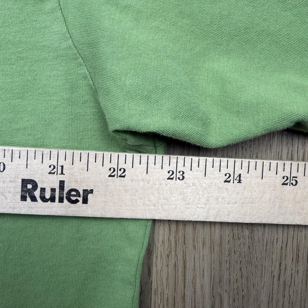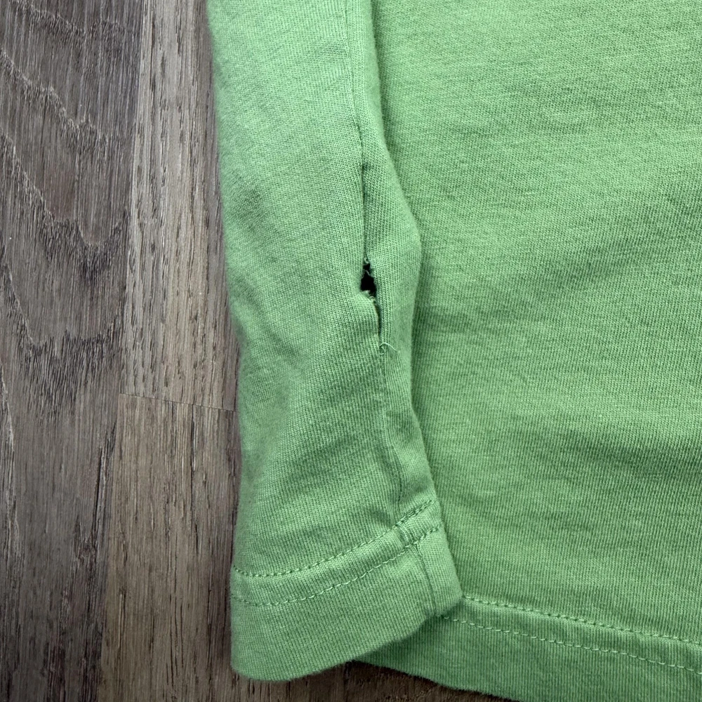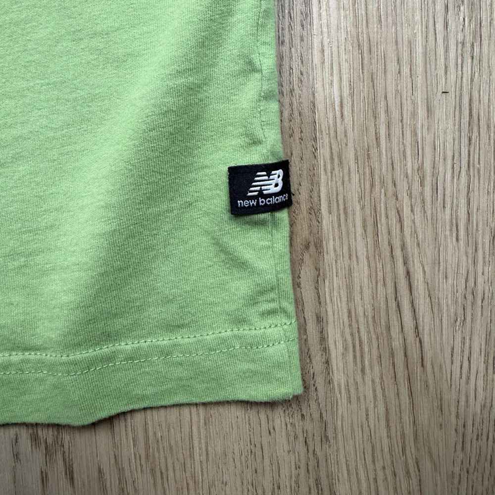 Brand: New Balance Style: Mens short sleeve crewneck graphic T-shirt with small front logo and large illustrated back print. Color: Light green knit fabric with dark green printed artwork and branding. Size: Mens Large (L) per woven neck label. Material: Fabric content and care information are listed on the interior care tag; specific fiber content is not fully visible in the photos. Details: Minimal front "new balance" text at left chest, large back building illustration featuring a "café new balance" storefront with café & bakery signage and "From Start To Finish." slogan with NB logo, ribbed crew neckline, short sleeves, straight hem, soft jersey knit construction, regular fit suitable for all-season casual streetwear or athletic-inspired wear. Label info: Black woven neck label with New Balance logo and text reading "new balance since 1906 L made in China," small woven NB logo tab at the left hem, and interior care label with multi-language care instructions. Special notes: There is a small open seam/hole at the lower side hem and a faint small mark on the front; refer to photos for close-ups. Garment is stored folded in a protective poly bag as shown.