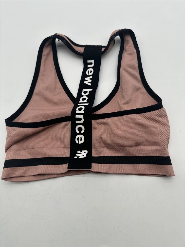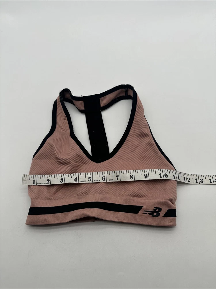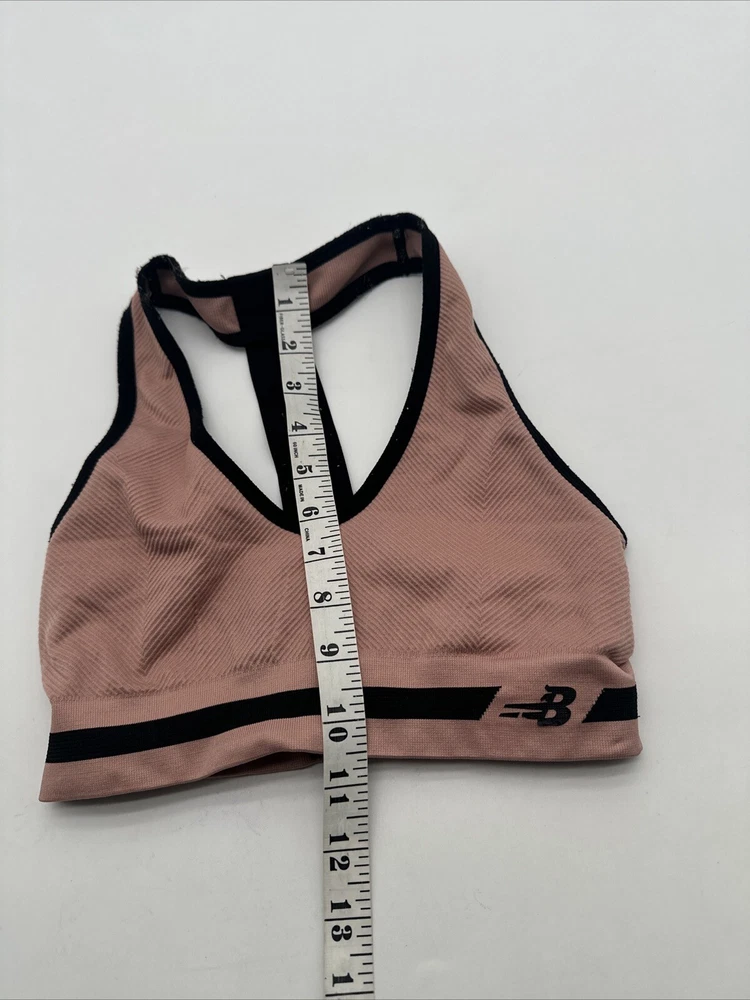 The product is a women's sports bra by New Balance in size Small. It features a solid pink color with the brand's logo on the front. The closure is a pullover style, making it easy to put on and take off. Made of a blend of polyester and cotton, this sports bra is designed for activewear use and offers easy care for convenience. Perfect for active women looking for a comfortable and supportive sports bra. *Check the images above for the flaws and measurements of the item.