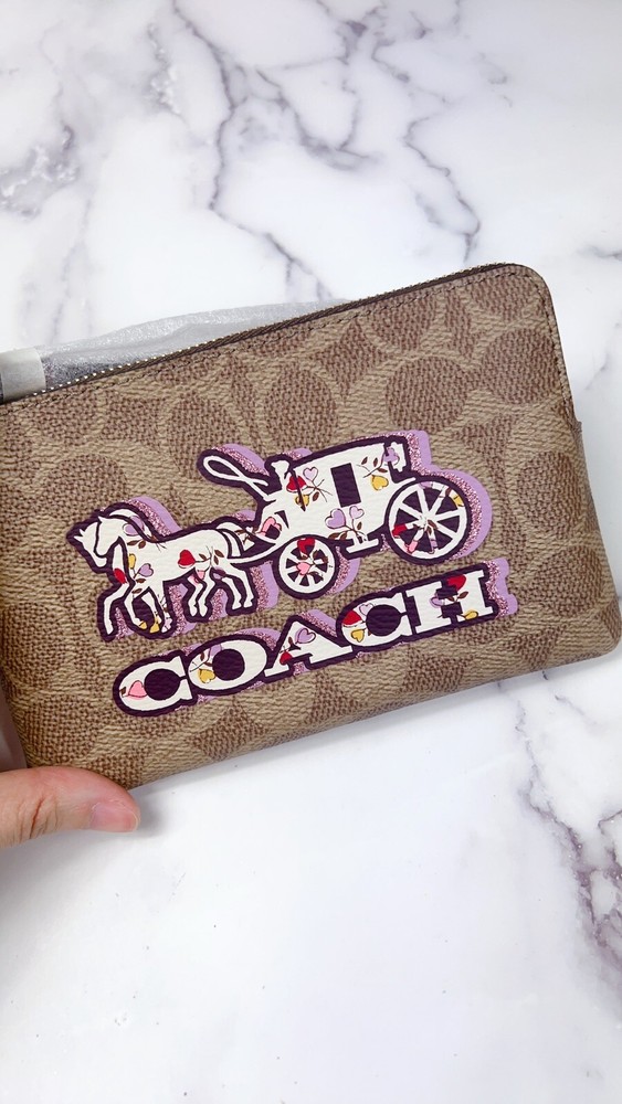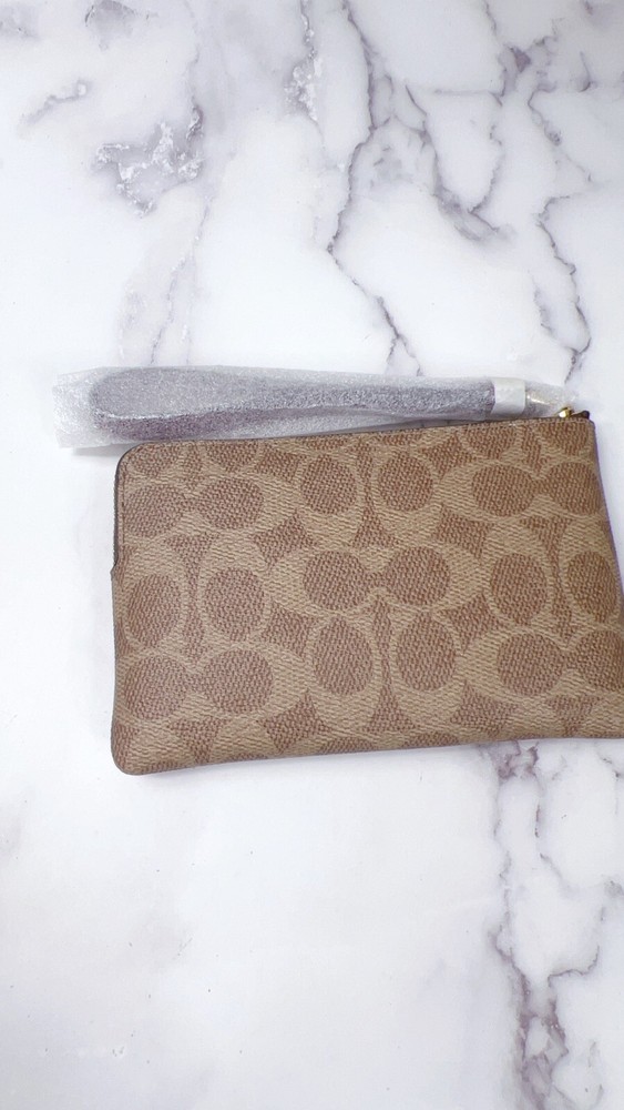 New Coach Corner Zip Wristlet in Tan Signature Canvas with Horse & Carriage Design