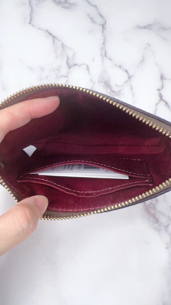 Price firm Free shipping Signature coated canvas Two credit card slots Zip-top closure, fabric lining Wrist strap attached 6 1/4" (L) x 4" (H) x 1/2" (W) Style No. CX589