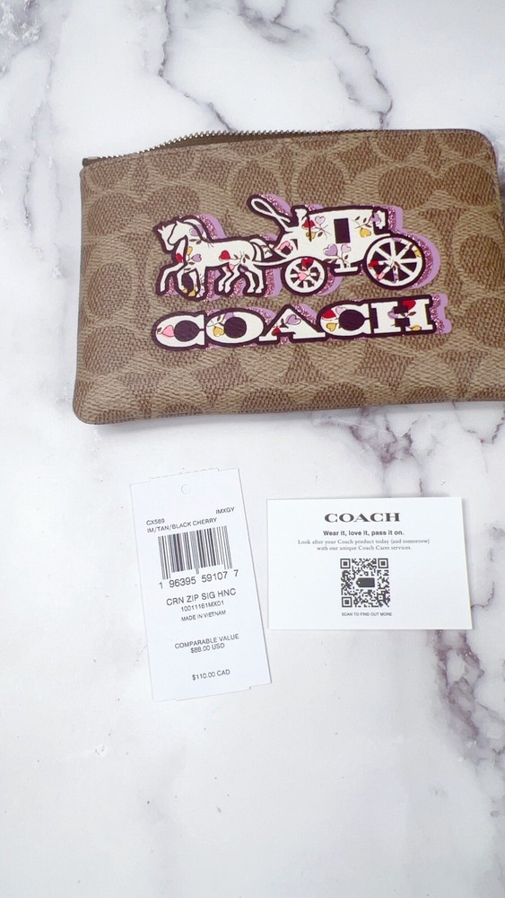 Type: Wristlet UPC: 196395591077 Fabric Type: Canvas Theme: Horse and Carriage Character: Horse and Carriage Material: Signature Coated Canvas Style: Wristlet Color: Tan Deep Cherry Multi Item Length: 6 1/4 inches gtin13: 196395591077 Item Width: 4 inches Department: Unisex MPN: CX589 Brand: Coach Features: Two Credit Card Slots, Zip Top Closure