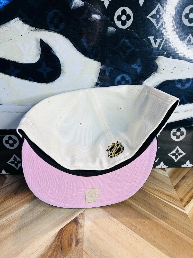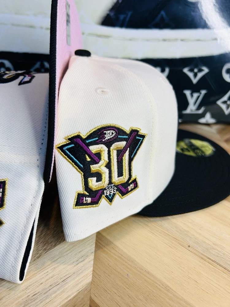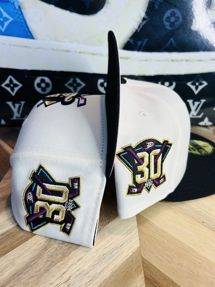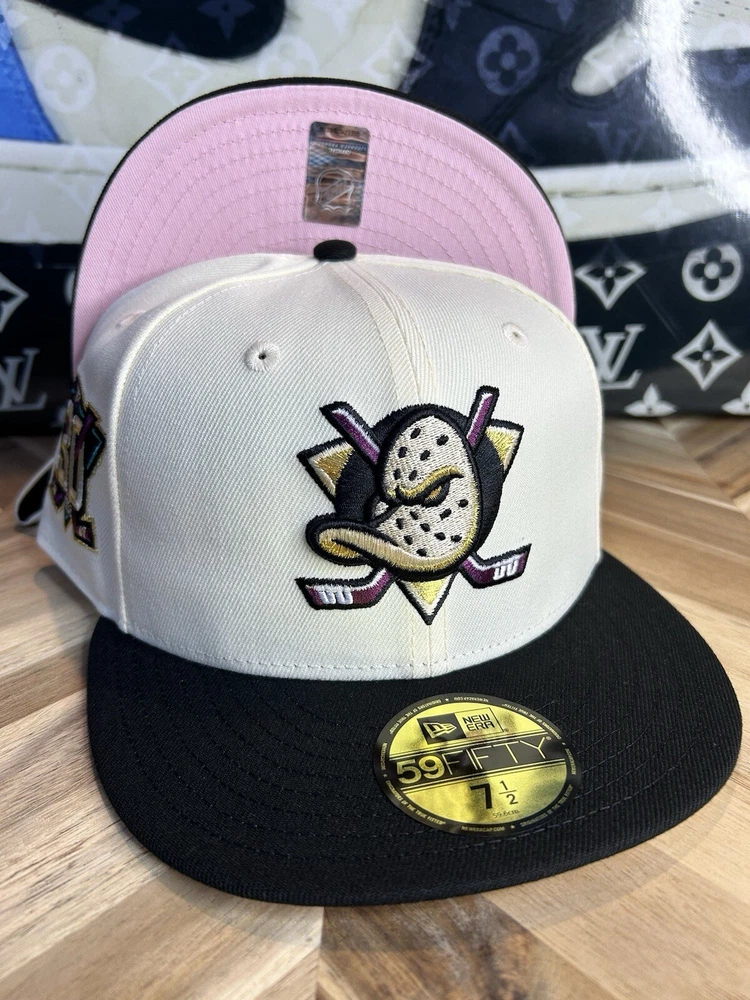 Get your hands on this rare and sold out New Era Prociety Rahnni Mighty Ducks NHL white hat. This exclusive hat features a solid pattern and is made with 100% polyester fabric, making it perfect for all seasons. The hat is designed with a upside down logo and is available in size 7 1/2. This hat is perfect for any sports fan, especially those who support the Mighty Ducks. It is made with high quality materials and is designed to last. Don't miss out on the chance to own this classic and stylish hat.
