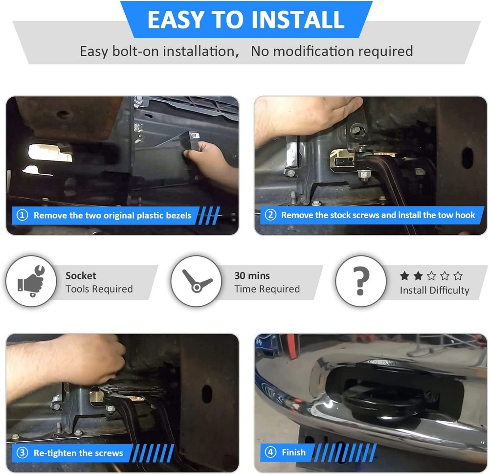 Item Description 【Fitment】 For Dodge ram front tow hooks fit for ram 1500 2009-2019. 【Material】 Made of heavy duty steel, provides 5,500 pounds of towing capacity.Durable, not easy to rust corrosion,Longer service life,support long-term outdoor work. 【Craft】 Black powder coated, prevent rust and corrosion, adapt to any bad weather. 【Package】 Include 2 hooks, 4 bolts and 1 sets of mounting brackets(the single one is spare). No need to drill or cut, just tighten the screws. 【OEM】 Original mold production, perfect replacement for OEM 82210967 68196982AA. Specifications Condition:100% Brand New Warranty: 90 Day Free Return:30 Day Color: Black Material: Made of high quality steel Fitment Fit For Dodge Ram 1500 2009-2019. Replace OEM #82210967 68196982AA. Please Double-Check that this is compatible with your vehicle. Package Included 2x tow hooks kit As pictures show FAQ: I purchased by mistake, how do I cancel the order? Please contact us ASAP. If the item has not been shipped out we can cancel the order for you. If the item was shipped out you can refuse the package and wait for the item to return to us. I received your item but it does not fit or is defective Please contact us so we can assist you on the matter. Buy with confidence Our quality is based on meeting the requirements of the manufacturer and improvement them in design problems manufacture. NOTE: (1)It would be highly appreciated if you might contact us first once you have any problems concerning the items. And you can expect all the issues would be resolved ASAP! (2)Please let us know before you send us the neutral/negative feedback that wont help to finish the issues. And I will definitely try my best to provide the best solutions which would meet our satisfactory! (3)According to the distance of the receipt address items would be sent from CA or NJ (4) This product does not include an installation manual