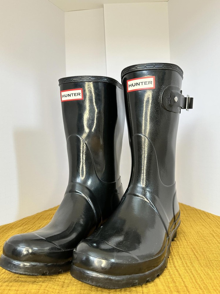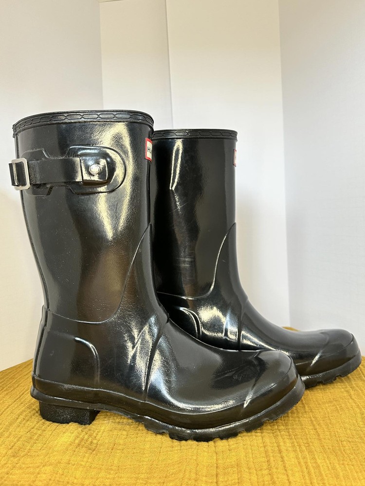 Get ready to tackle the rain in style with these Hunter Original Black Rain Boots in Original Gloss! The Women's Original Short Rain Boot is a shorter version of the iconic Hunter Original Tall Boot and perfect for wet-weather conditions. Formed of natural rubber, each boot is handcrafted and assembled over three days and then vulcanised for superior protection before having the high gloss finish applied. The Hunter Original tread pattern and comfortable 100% recycled polyester lining completes the design on this 100% waterproof boot. - Classic black color for versatile styling - Adjustable strap for a customizable fit - Durable construction for longevity - Textured sole for enhanced traction on slippery surfaces
