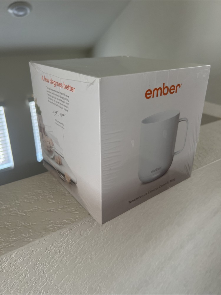 Mug is in the box with plastic, Bluetooth connectable through the Ember app.