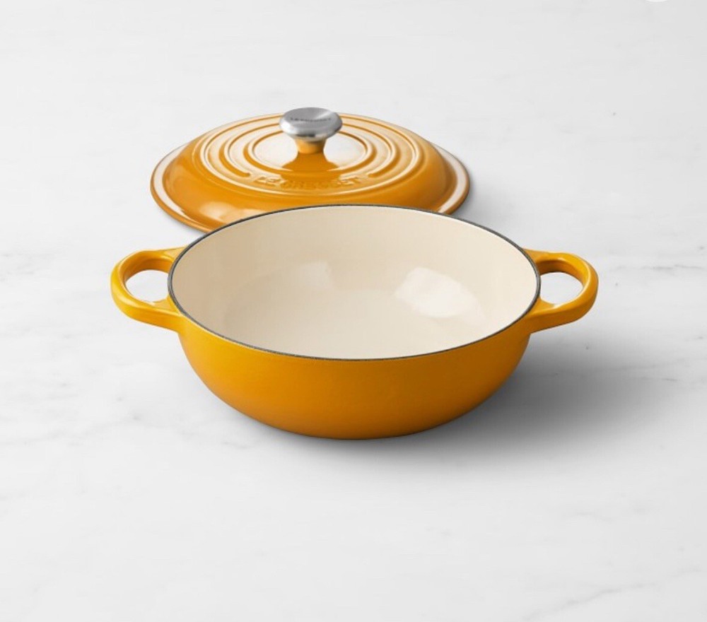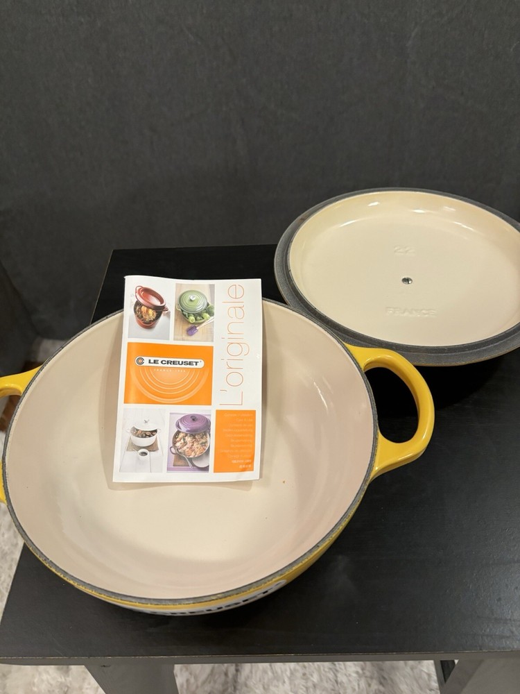 New Le Creuset Enameled Cast Iron Signature French Oven, 2 1/2-Qt Size: 8 3/4" diam., 11 3/4" diam. with handles; 3 1/2" high, 4 1/2" high with lid. 2 1/2-qt. cap. With tall, gently sloping sides and a domed lid, our exclusive Le Creuset pot proves remarkably versatile in the kitchen. The curved sides make stirring more efficient, so it's ideal for preparing sauces, stocks, soups and risotto. The depth of the French oven accommodates stir-fries, braises, shallow frying and one-pot meals, as well as baked casseroles, bread pudding and breakfast strata. The multitasking pan is durable enough for everyday use and elegant enough for table service. Serves 1-2 Open box item