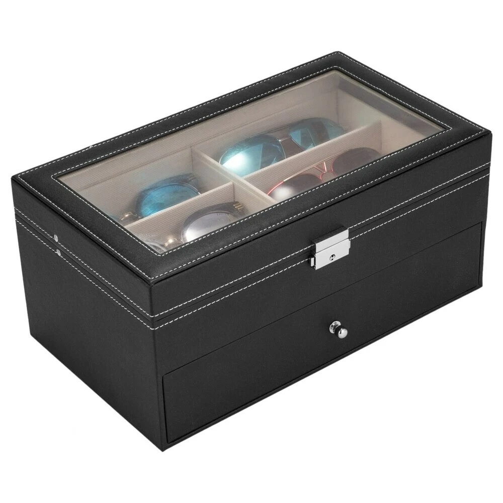 Introductions: Glasses Display Box is great for personal use, shop display and home decoration. What a great way to not only display your jewelry but also save time in the morning. Real glass top provides you with better view to choose your beloved jewelry. The lid has a metal hinge attached to keep it from falling back. Metal lock with keys makes sure of safety. This is a nice showcase and works well to keep your glasses safe and organized. Nice gift idea for girls, boys, women and men. Features: 1. High quality PU leather glasses and jewelry box with attractive appearance,simple structure,fine workmanship and sturdy construction 2. It's divided into plenty of unit space which are easy to clean and maintain,It will keep your Eyeglasses and sunglasses securely 3. This elegant glasses case allows you to show your glasses and other jewelry while protecting them away from dust,fingerprints,scratches and thieves 4. Clear glass top gives you a open view and you can find your favorite treasure in seconds with this unique glasses and jewelry box. Perfect for home and business use,and a wonderful gift idea Specifications: 1. Material: High Grade PU Leather,Medium Density Fiberboard 2. Window: Glass 3. Color: Black 4. Product Dimensions (L x W x H): 13.4"" x 7.6"" x 6"" (34 x 19 x 15 cm) First Tier: Slot Size (L x W x H): 6.2"" x 2.3"" x 1.6"" (15.7 x 5.8 x 4.1 cm) Second Tier: Slot Size (L x W x H): 6.2"" x 2.3"" x 1.6"" (15.7 x 5.8 x 4.1 cm) Packaging Includes: 1 x Glasses Display Box