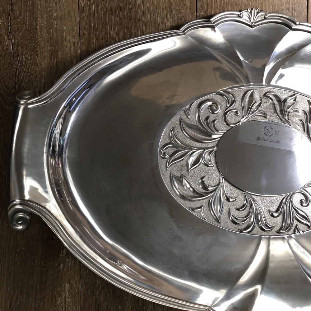 New Lenox Large Metal Serveware Butler's Pantry Oversized Tray By our observations this tray is in new condition. It does have some areas of scratches from being stored. It measures approx 22 1/2 inches in length and 15 1/2 inches in width. Please see pictures for information. We are a thrift shop located in Peachtree City, Georgia and all of our profits are returned to our community. We make every effort to test all electronic equipment that we receive and closely examine everything else which we will describe in detail if needed. If you have any questions, please message us directly and we would be more than happy to answer any of them.