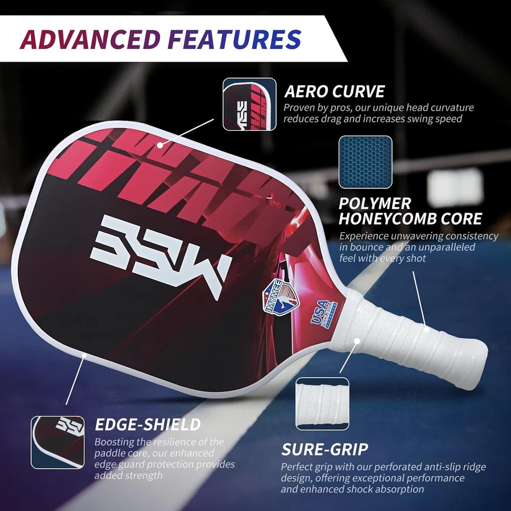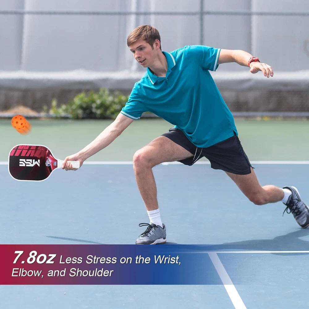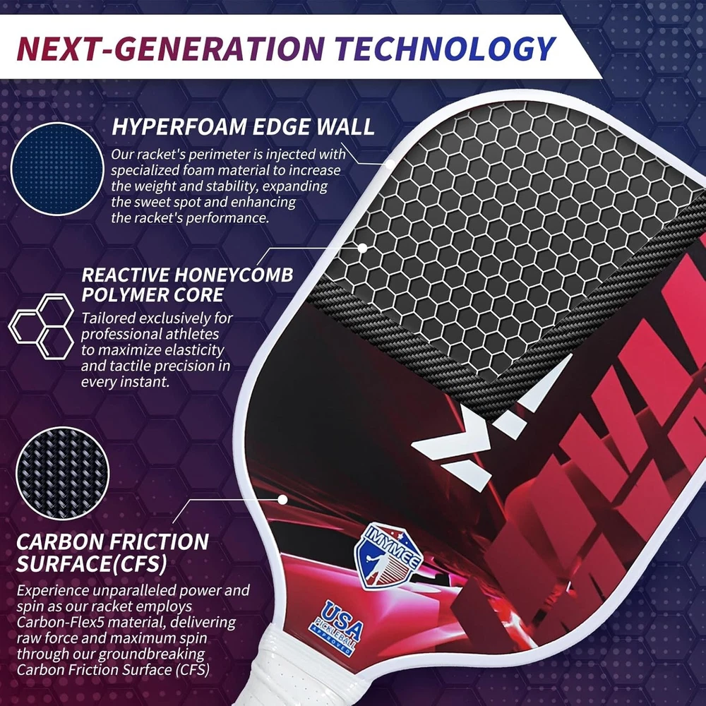 Carbon Fiber Pickleball Paddle with Textured Non-Slip Cushioned Grip Handle Including: Paddle, Neoprene Paddle Cover, 2x Handle Glue · 【 Premium carbon fiber surface 】 Featuring an advanced V8 carbon fiber surface, offers exceptional hardness, enhancing shot accuracy and control. · 【 Superior Design, Mastering the Game 】 The 16mm polypropylene honeycomb core is a uniquely strategic design that incorporates a multi-layered structure, minimizing vibrations and providing unparalleled control. · 【 Extraordinary Design, Pushing the Limits 】 Our ingeniously designed racquet shape not only leaves a lasting impression but also delivers a massive sweet spot for you in the game . · 【 Exceptional Control, Comfortable Grip 】 The handle, crafted with soft synthetic leather and a breathable perforated design, offers a non-slip, durable grip. · 【 Professional Racquet Specifications 】 The carbon fiber pickleball paddle boasts exceptionally high strength and stability, enduring intense gameplay. The paddle measures 16.5 inches in length, 7.5 inches in width, and weighs 8.0 ounces, with a handle length of 5.5 inches