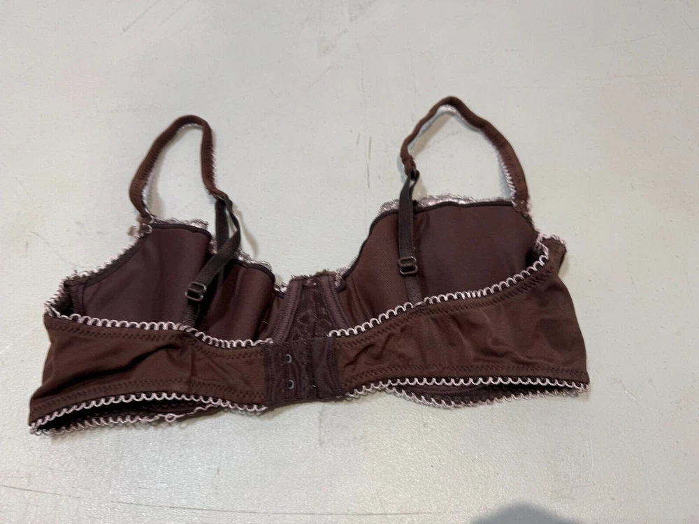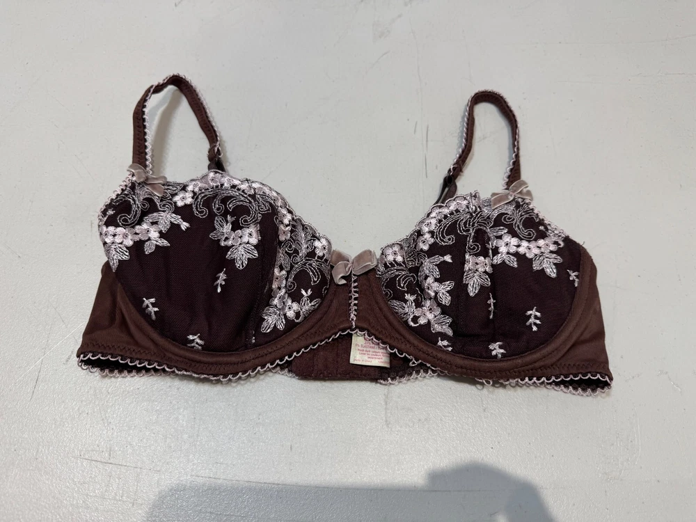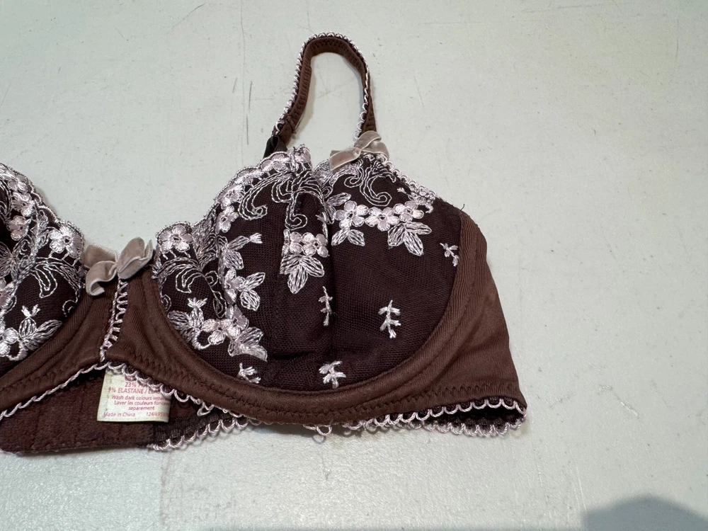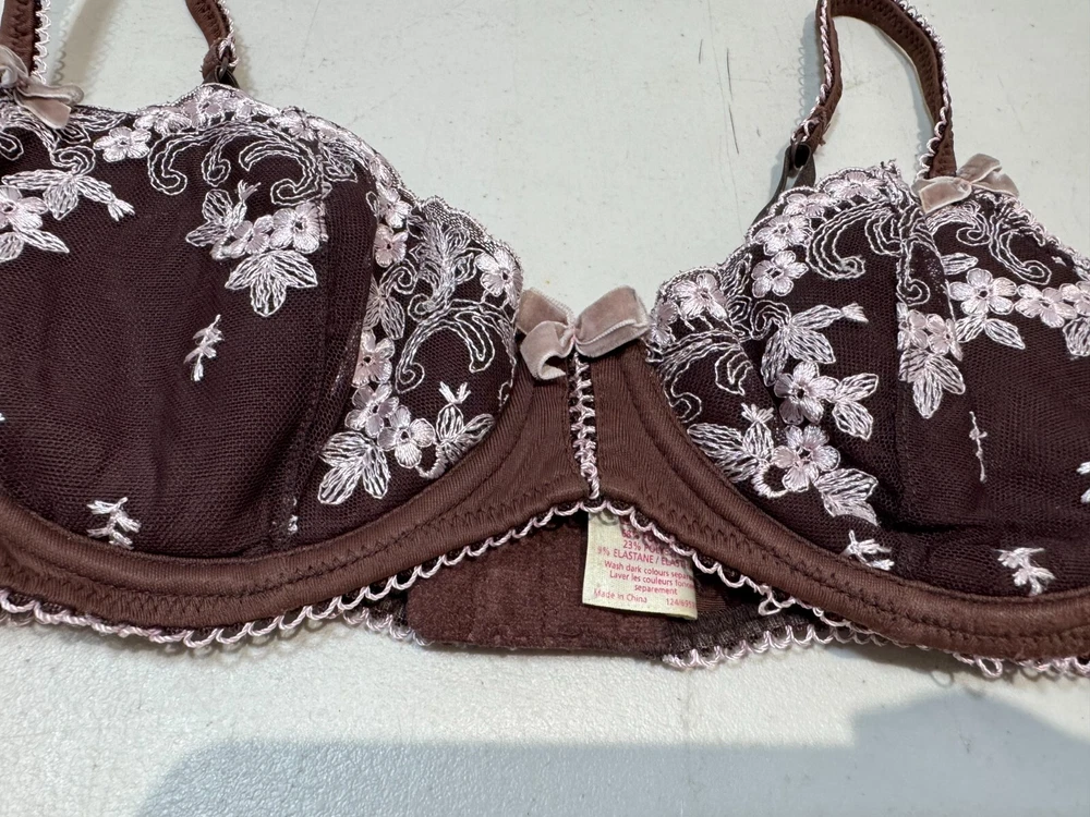 Elevate your lingerie collection with this stunning balconette bra from New Look. This bra features beautiful floral lace detailing and embroidered accents, adding a touch of elegance to your intimates. The underwired bra is designed to provide maximum support and comfort, with a hook and eye closure for easy wear. Crafted from high-quality lace fabric and padded for added shape, this bra is perfect for everyday wear. The brown colour complements any skin tone, and the bra strap adds an extra touch of femininity. This bra is available in size 34B and is a must-have for any lingerie lover.