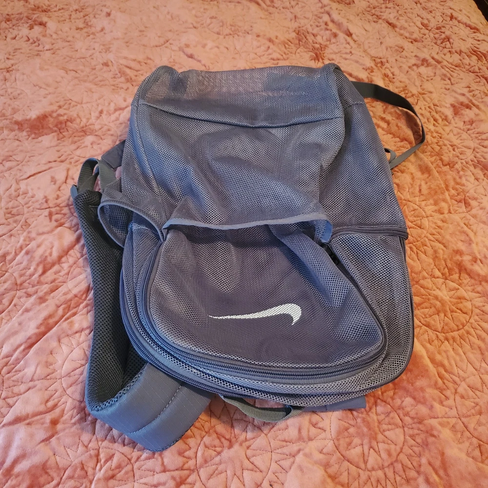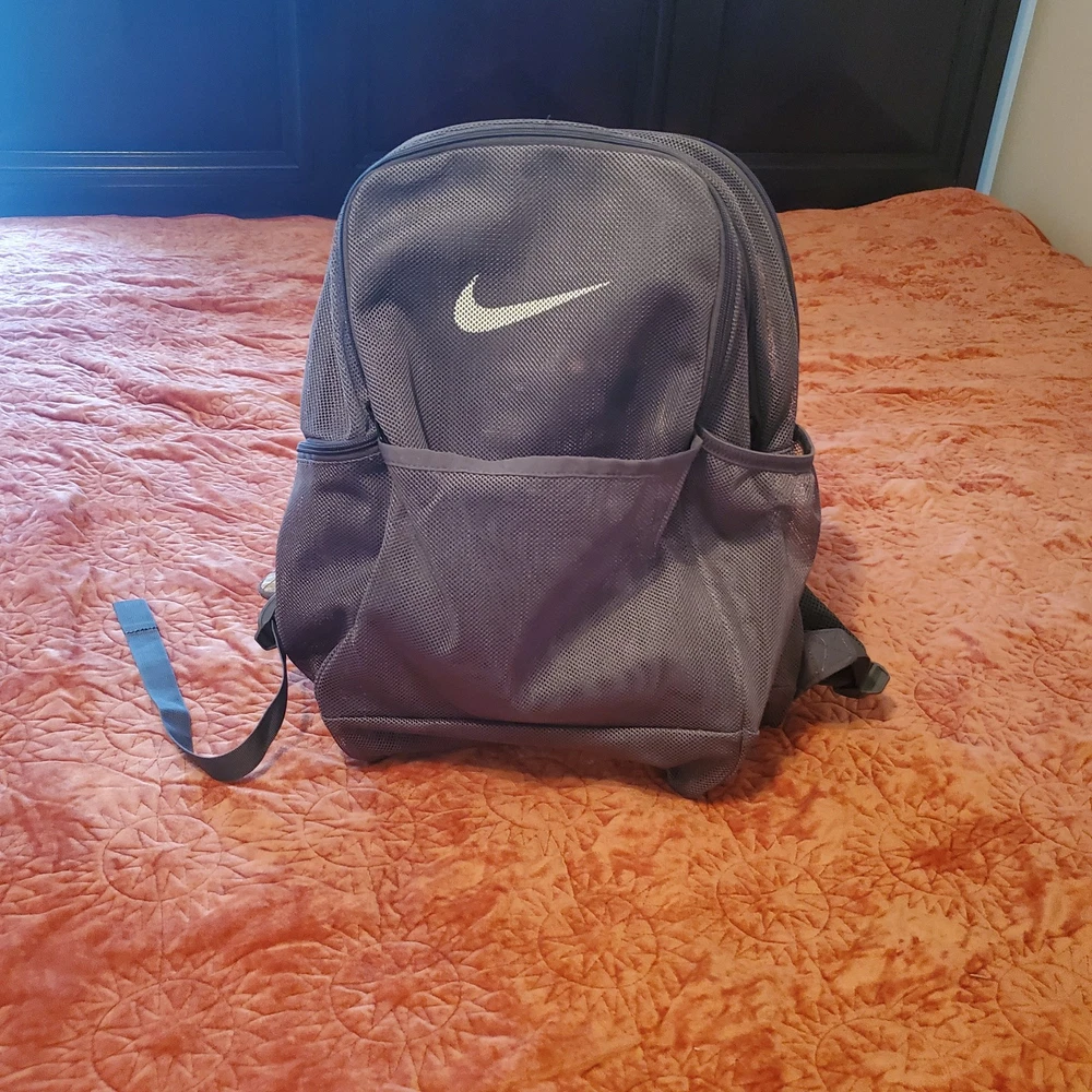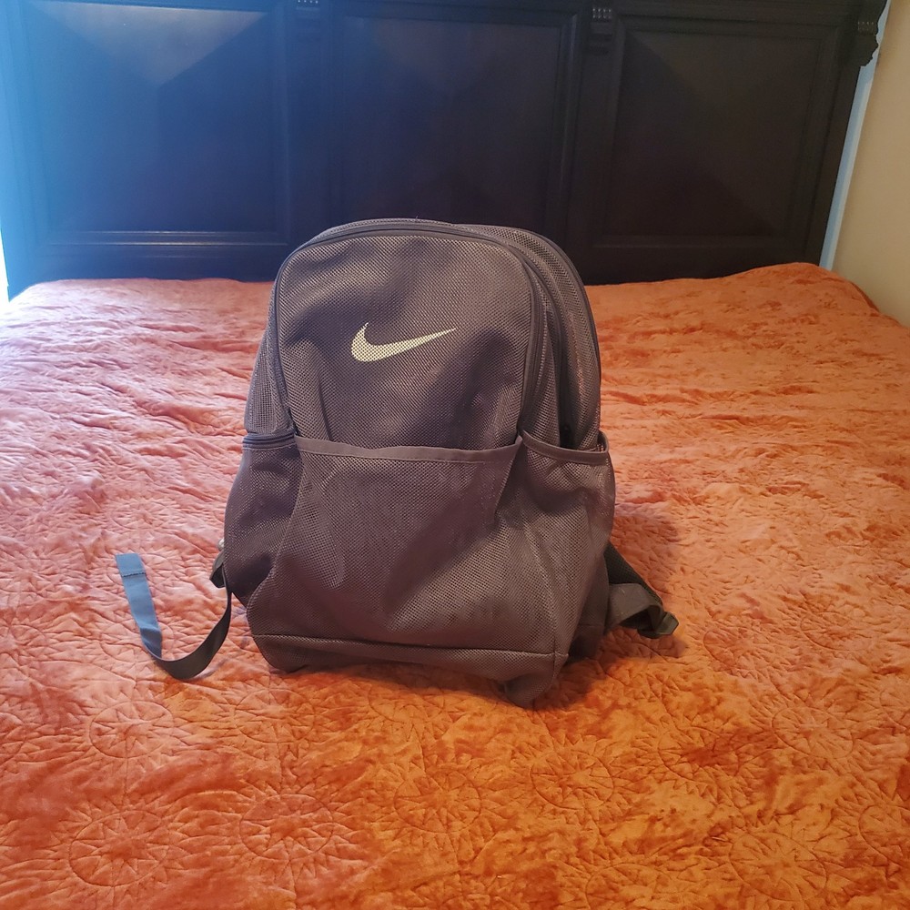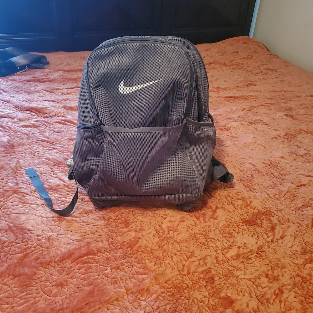 This is a large Nike Brasilia Mesh Training Backpack in gray, designed for unisex kids. It features a solid pattern with a see-through mesh fabric type, a zip closure, and a school theme. The backpack is 12 inches wide and 16 inches high, made of polyester material. It is suitable for back-to-school use and is brand new without tags. if you have any question feel free to message me