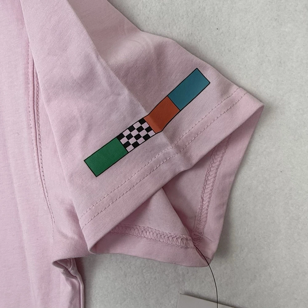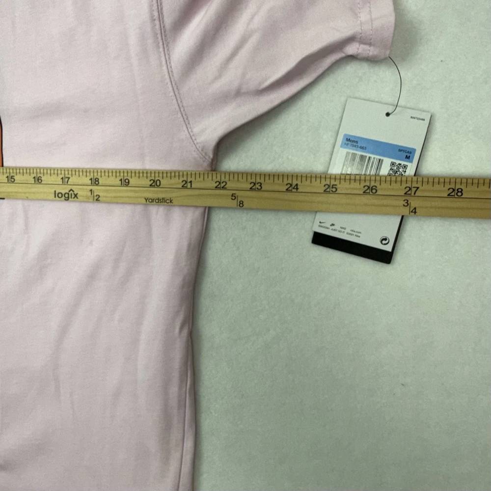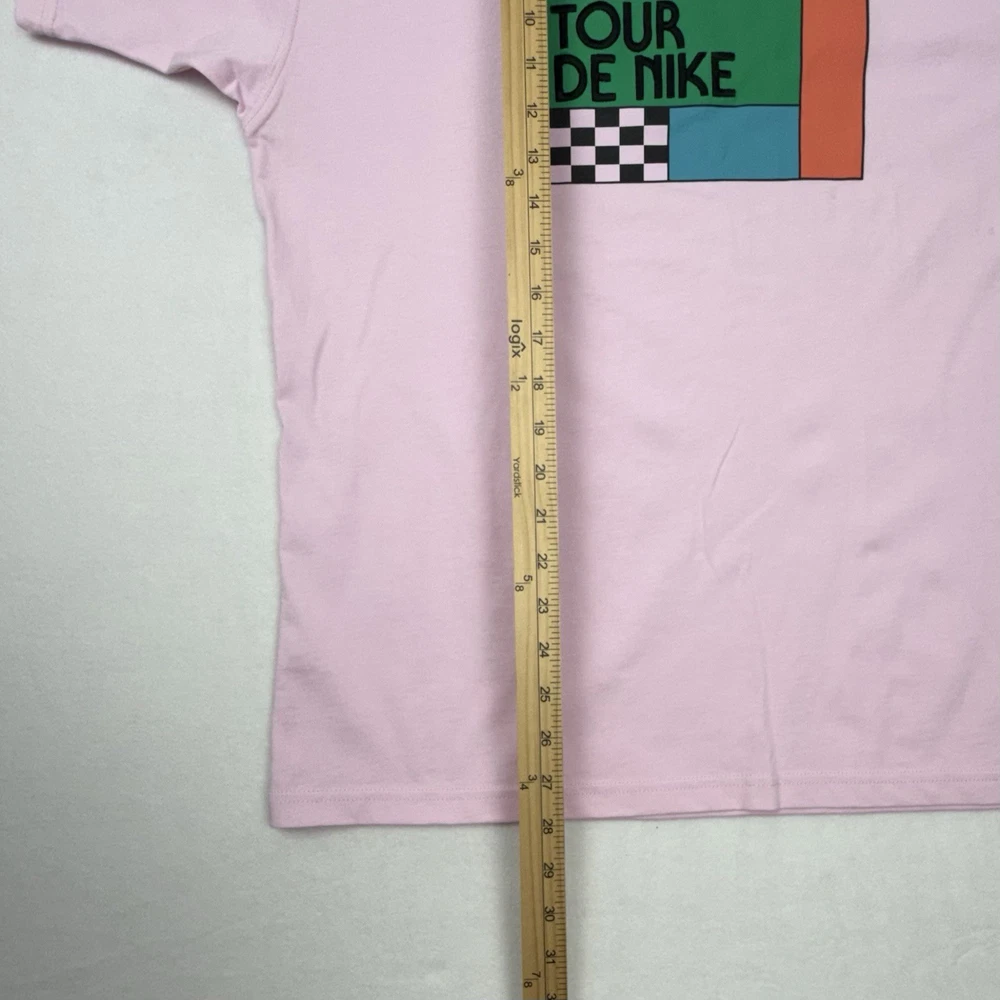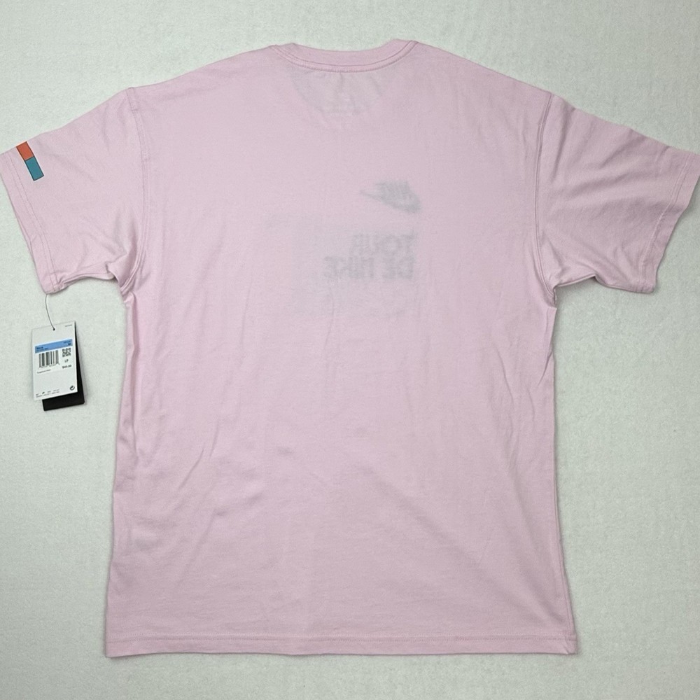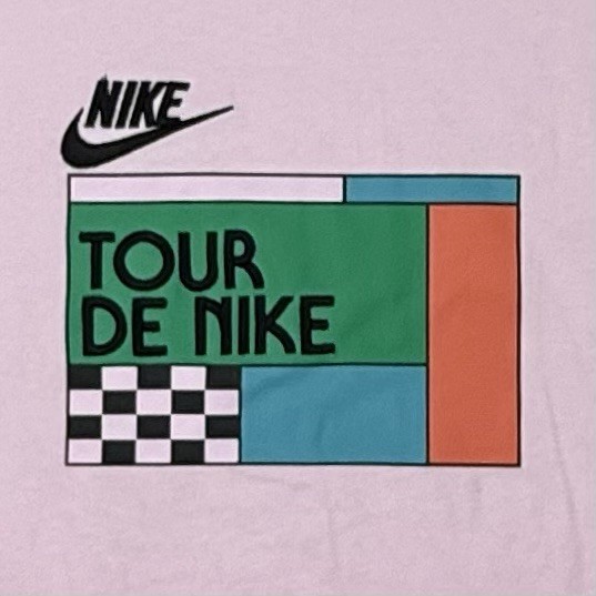 1249 - 2.26 - 6.5 Nike Nike Tour De Nike Men's Medium (Loose Fit) T-Shirt, Crew Neck, Short Sleeve Pale Pink tee with multi-color graphics Black Embroidered "Nike" and "Tour De Nike" Retails for $45.00 This one is brand new with tags