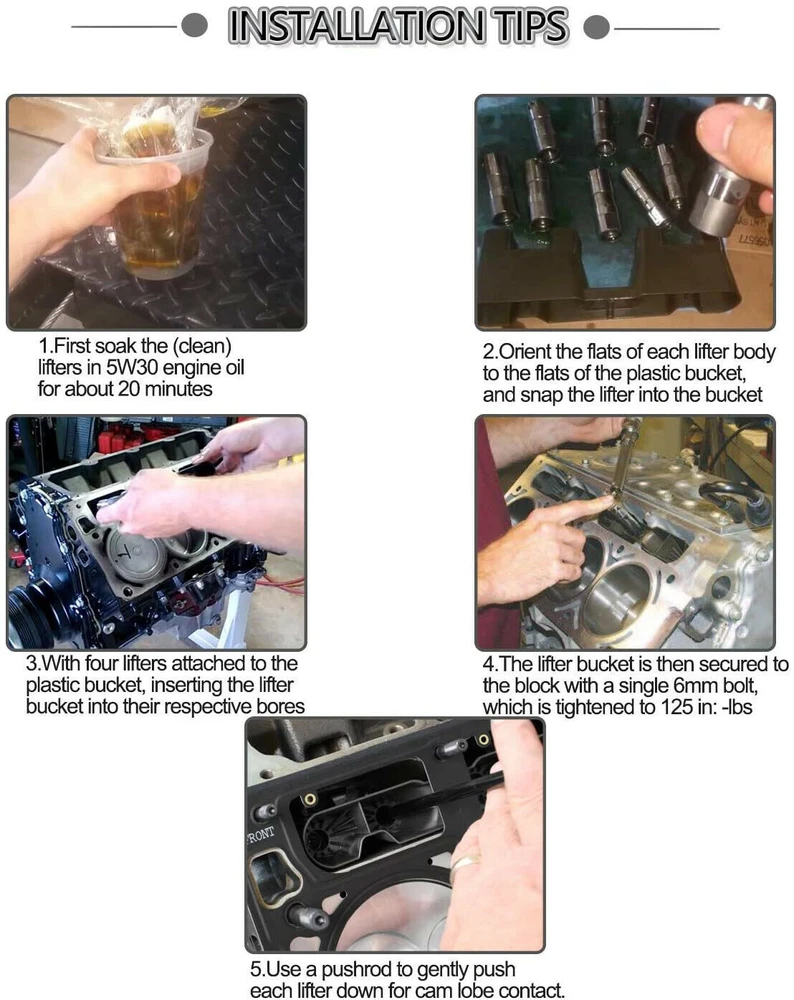 16PCS 12499225 HL124 GM Performance Hydraulic Roller Lifters w/4 Trays Package include: 16 x Hydraulic Roller Lifters 4 x Guide Trays Type: Engine Valve Lifter Feature: Adjusts the valves on your vehicle's engine for proper performance. Replacement part for your GM vehicle's original factory component. Manufactured to GM OE specification for fit, form, and function. Offering the quality, reliability, and durability of GM OE. ***OE#12499225, 17120735,17122490,17089852,17108057,17120070,17121905,HL124, 10530-16,91113,HT-2148,12595365,5234890,5235498,5233745,5234670,JB2079,HL123,JB2270, HL112 ,HL118,HL119,L2148 ***Compatible with Chevy (Chevrolet) GMC Buick Cadillac Hummer Oldsmobile Pontiac 4.8,5.3,5.7,6.0,6.2,7.0 GM LS ,LS2,LS3,LS7 .Use these lifters along with an LS3 Valley cover to eliminate DOD ( Displacement on Demand) used in newer model engines. Note: Before starting the engine, do as much oil refilling procedure as possible to reduce the chance of air entering the hydraulic tappet If there is still air in and noise occurs, follow the exhaust procedure to eliminate the noise How to remove air: 1. There is noise after starting the engine, the engine speed should be kept at 2000-3000 rpm, continuous running for minutes 2. Then let the engine idle for 30 seconds 3. After the above steps, most of the noise can be eliminated. If there is still noise, the above working procedure can be repeated. 4. If repeating the above operation 6 times still does not solve the problem, please contact us