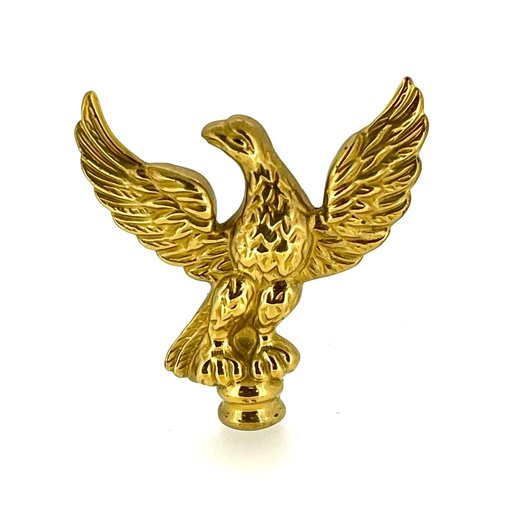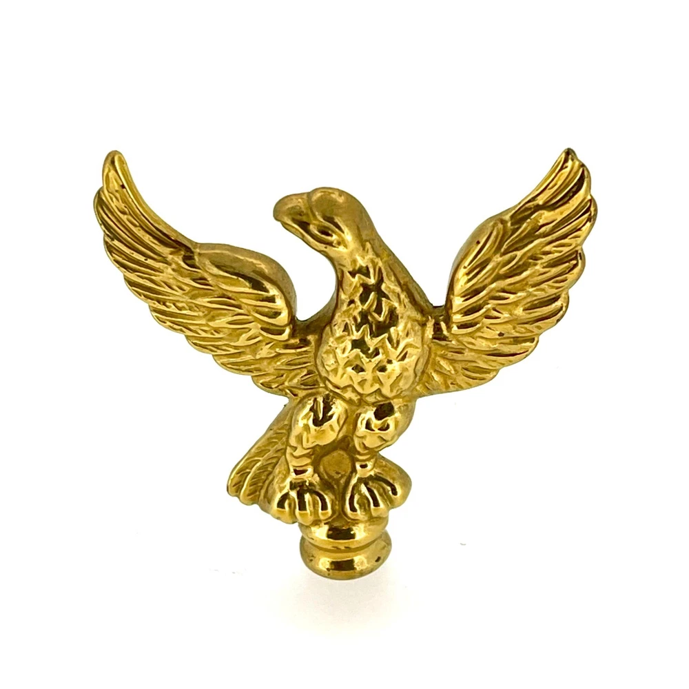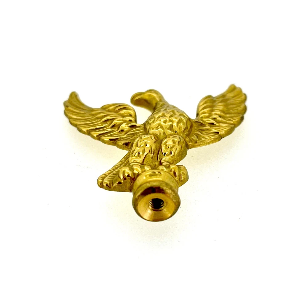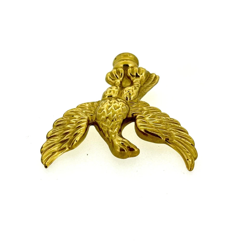 New Old Stock Polished Brass Clock Case Foot – 41mm Wide, 12mm High, 58mm Corner to Corner Item Description Overview: Condition: New old stock (NOS) – unused but stored for an extended period Material: Polished brass Design: Eagle-shaped finial Dimensions: Total Height: 52mm Width (Wingspan): 50mm Base Diameter: 10mm Details: This polished brass eagle-shaped clock case finial is a striking and regal addition to any clock restoration or decorative project. The eagle design symbolizes strength and elegance, making it a perfect choice for enhancing antique or vintage clock cases. Features: Material: Solid polished brass with a reflective, high-shine finish. Design: Intricate detailing of the eagle’s wings and body for a sophisticated appearance. Compact size suitable for various clock types. Condition: New old stock (NOS): Unused but may show minor signs of age from long-term storage. No dents or damage—ready for installation. Compatibility: Suitable for a variety of clocks, including longcase (grandfather), mantel, and bracket clocks . Please refer to the dimensions provided to ensure compatibility with your clock case. Additional Information: This eagle finial is ideal for restoration enthusiasts, adding a unique and elegant touch to any clock. Whether you’re replacing a missing finial or upgrading the style of a timepiece, this decorative brass topper will make a standout feature.