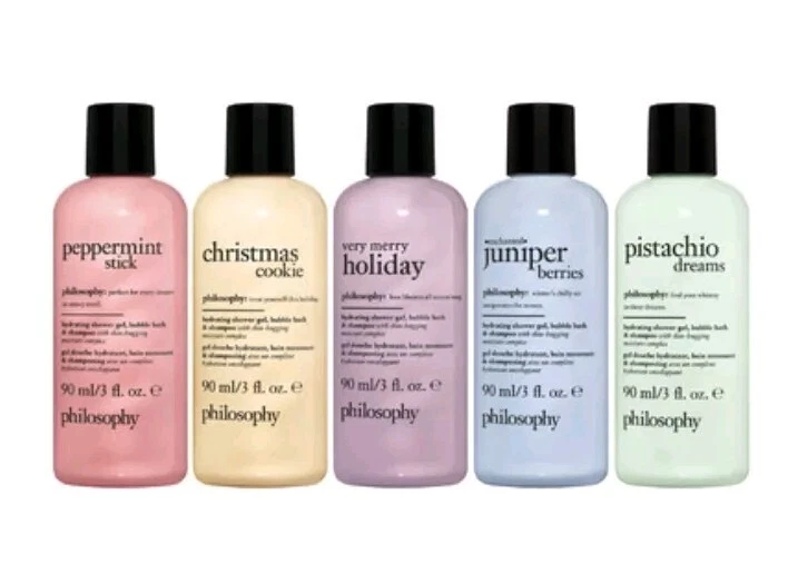 New Philosophy 5 Pc (3floz/90ml) Shower Gel Wishlist Gift Set Pistachio Holiday. peppermint stick hydrating shower gel, bubble bath, & shampoo 3oz christmas cookie hydrating shower gel, bubble bath, & shampoo 3oz very merry holiday hydrating shower gel, bubble bath, & shampoo 3oz enchanted juniper berries hydrating shower gel, bubble bath, & shampoo 3oz pistachio dreams hydrating shower gel, bubble bath, & shampoo 3oz New in box(minor dent)
