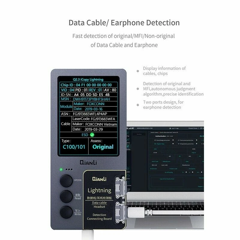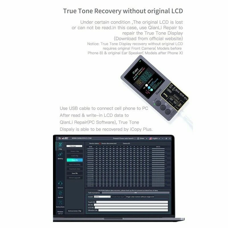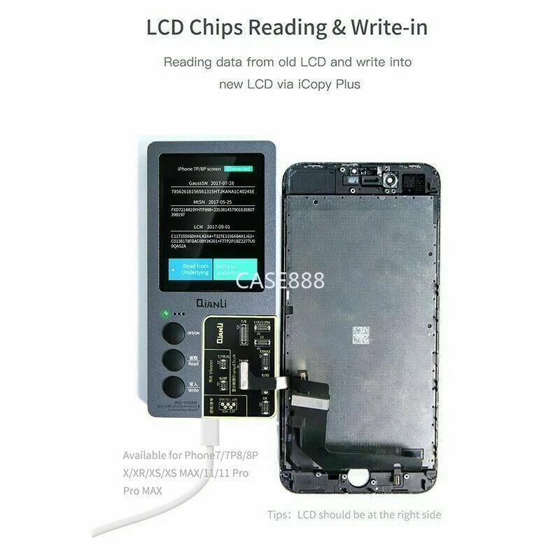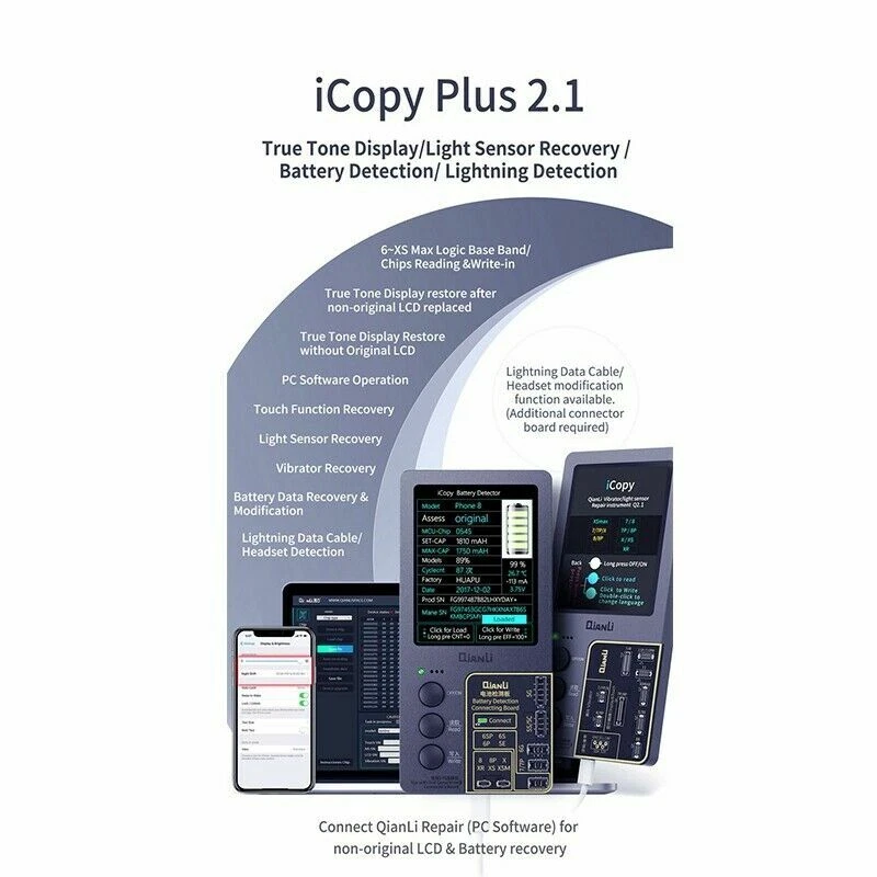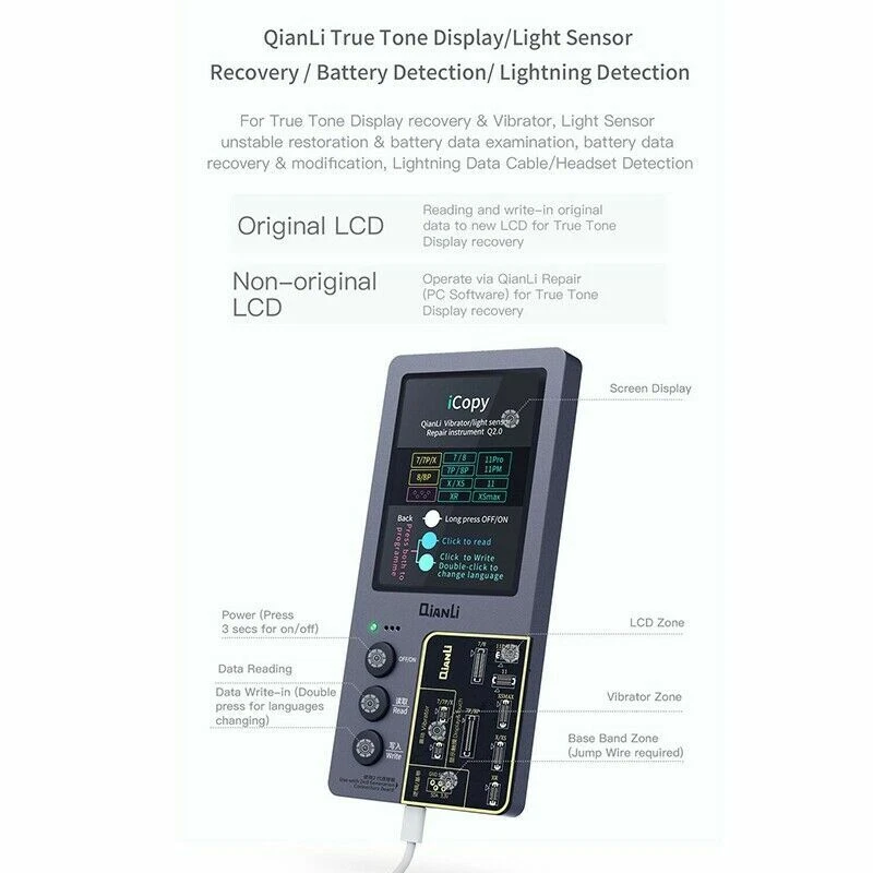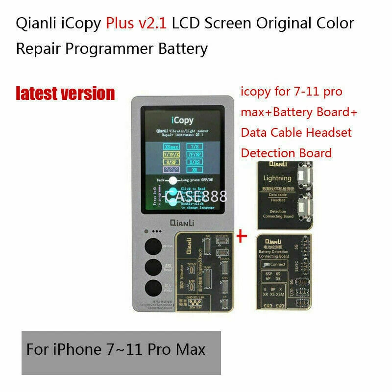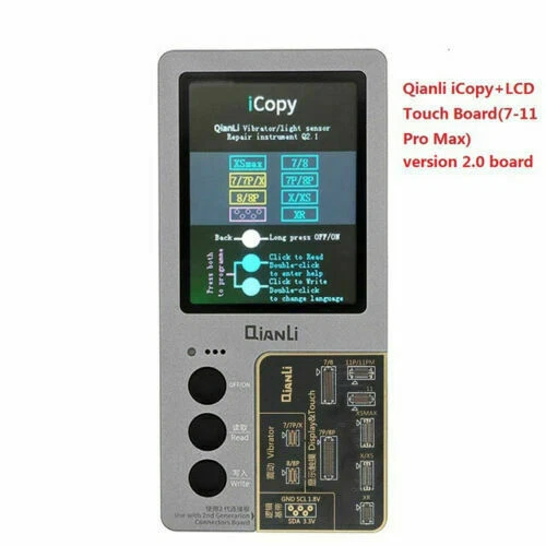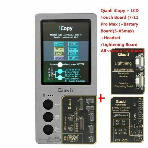 Product Description: Description: Qianli iCopy Plus v2.1 (latest version!) Vibrator/Light Sensor/True Tone Display Repair Instrument For iPhone 7~11 Pro Max. New in Stock Includes Battery Detection Board For iPhone 5~XS Max.t Include Lightning Data Cable Headset Detection Board. Include battery board Functions: LCD Screen Display and Touch EPROM transfer This allows you to transfer the chip data from the original for iPhone screen to a replacement screen. This procedure restores the original colour. This Function Supports iPhone 7/7P/8/8P/X/XR/XS/XS MAX /11/11pro/11pro max Vibrating Motor Data Transfer Simply connect the original taptic engine and transfer original taptic engines data to the new taptic engine vibrating motor This Function Supports iPhone 7/7P/8/8P/X Logic Baseband Transfer Connect to the baseband chip via jump wire using ISP pinouts on the logic board of the iPhone to the iCopy. Then use the menu system of the iCopy to acquire the baseband data. This Function Supports for iPhone New Arrival Tips: Please allow minor deviation due to manual measurement. Due to the difference between different monitors, the picture may not reflect the actual color of the item. Package Include : icopy for 7-11 pro max(2ndG) / icopy for 7-11p MAX Battery Board / icopy for 7-11 pro max Battery Board Data Cable Headset Detection Board Shipping: Shipping Estimated Delivery Time *Economy(without tracking): 11-35 business days *SpeedPAK(with tracking): 8-12 business days *EMS/DHL(with tracking): 7-10 business days, need to pay extra shipping cost For faraway region or countries (Brazil, Mexico, Peru, etc), the transit time may be longer than Overall Transit Time Frame. Notes, the delivery time may vary due to public holidays, natural disasters, customs issue and other unexpected impact, etc. Customs Declaration: Import duties, taxes and charges are not included in the item price or shipping charges. These charges are the buyer's responsibility. Please check with your country’s customs office to determine what these additional costs will be prior to biddingying. Payment: We accept PayPal ONLY currently. Payment must be made within 4 business days. If you do not have Paypal account, please register at (www.paypal.com). Return & Refund: Returns are accepted within 30 days. Please read the item description and check the pictures carefully before bidding. Return or refund is available only if item DOA or there's error in item description causing the item not fitting your need. In such cases, seller pays for all related shipping cost if any. Returns are also acceptable if buyer purchased this by mistake and item still in good condition for reselling. Buyer is responsible for all related shipping cost. Feedback: As long as you are satisfied with your purchase, please kindly leave us a 5 stars Positive Feedback , as it is very important for our store performance. If there is any problem with your order, please contact us and give us a chance to resolve your problem Before leaving us a negative feedback.