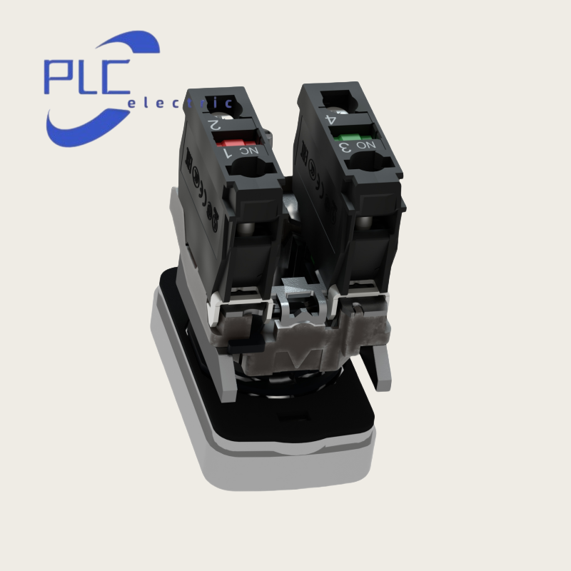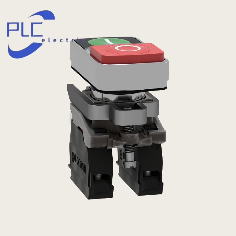 Illuminated double headed push button, Harmony XB4, metal, 22mm, 1 green flush I + 1 pilot light + 1 red projecting O, 240V AC, 1NO + 1NC