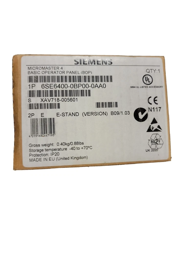 Controller Platform: MICROMASTER Brand: Siemens Type: Basic Operator Panel UPC: Does not apply gtin13: Does not apply Model: 6SE6400-0B00-0AA0 MPN: 6SE6400-0BP00-0AA0 Country/Region of Manufacture: United Kingdom