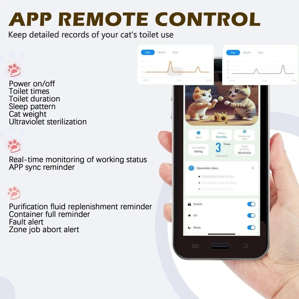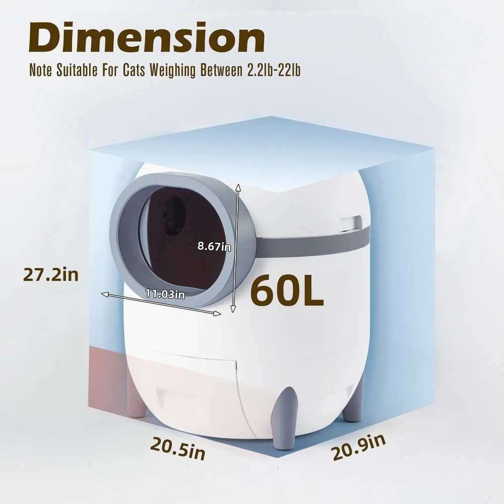 Details: Are you tired of scooping poop every single day? Worried about your cat's health while you're away? Well, worry no more! Our automated litter box is here to save the day. With the companion app, you can track your cat's weight, toilet habits, and monitor the litter box's status with ease. Say goodbye to the hassle of constant cleaning! With a spacious 60-liter capacity, it's perfect for cats of all sizes. Whether you have one furry friend or a whole bunch, our litter box provides a clean and comfortable space for them all. 【App Control & Monitoring】 Our app allows remote control and real-time monitoring of key functions such as power status, sleep mode, and refill reminders. Detailed usage records, including toilet times, duration, and cat weight, are conveniently stored for your reference. 【Advanced Sensor Technology】 Equipped with infrared sensors; our litter box ensures your cat's safety by pausing operation when your cat approaches. Additionally, a weight sensor accurately records your cat's weight and syncs the data to your phone. 【Spacious Design】 With a generous 60-liter capacity, our automatic litter box accommodates cats weighing up to 22 pounds, providing ample space for comfortable use. The 9-liter bottom bin can hold up to 15 days' worth of litter, reducing the need for frequent maintenance. 【Easy Maintenance】 Featuring a streamlined design, our litter box is effortless to disassemble and clean. The removable components facilitate quick cleaning, while the smooth structure ensures thorough sanitation. 【Versatile Compatibility】 Compatible with various litter materials such as tofu, bentonite, mineral, or mixed cat litter, our litter box offers flexibility to suit your preferences. Features Wi-Fi Connection Deodorizing and bacteriostatic Security protection APP intelligent remote control 60L large toilet space Health data record AI Learning Ultraviolet sterilization Specification Color: White/ Grey Overall: 20.5"L x 20.9"W x 27.2"H Door Size: 11.03L x 8.67H Volume: 60L Product Weight: 33LBS Specifications Assembled Dimensions Select an option to see dimensions Material Plastic Assembly Assembled Color White Size Extra Large Type Litter Box Enclosure Model Number Cat Furniture