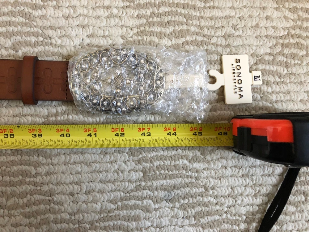 FOR SALE IS A BRAND NEW (WITH TAGS) SONOMA LIFE + STYLE WOMEN'S BELT. COLOR: COGNAC (BROWN) SIZE: MEDIUM 40" long without buckle OVERALL LENGTH: 1.75 inches wide and is about 43.5 inches long including buckle Here's the size chart from KOHL'S: Size Chart S 38" length M 40'' length L 42'' length XL 44" length SOLID DESIGN WITH BEAUTIFUL BUCKLE REGULAR PRICE: $30 ON TAG