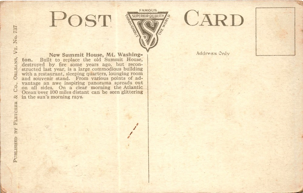 MAKE AN OFFER. THE MORE YOU BUY THE BETTER DEAL I WILL ACCEPT The postcard features an image of the New Summit House located in the Presidential Range of the White Mountains in New Hampshire. The New Summit House was built to replace the old Summit House, which was destroyed by fire. It is described as a large and commodious building with a restaurant, sleeping quarters, lounging room, and souvenir stand.