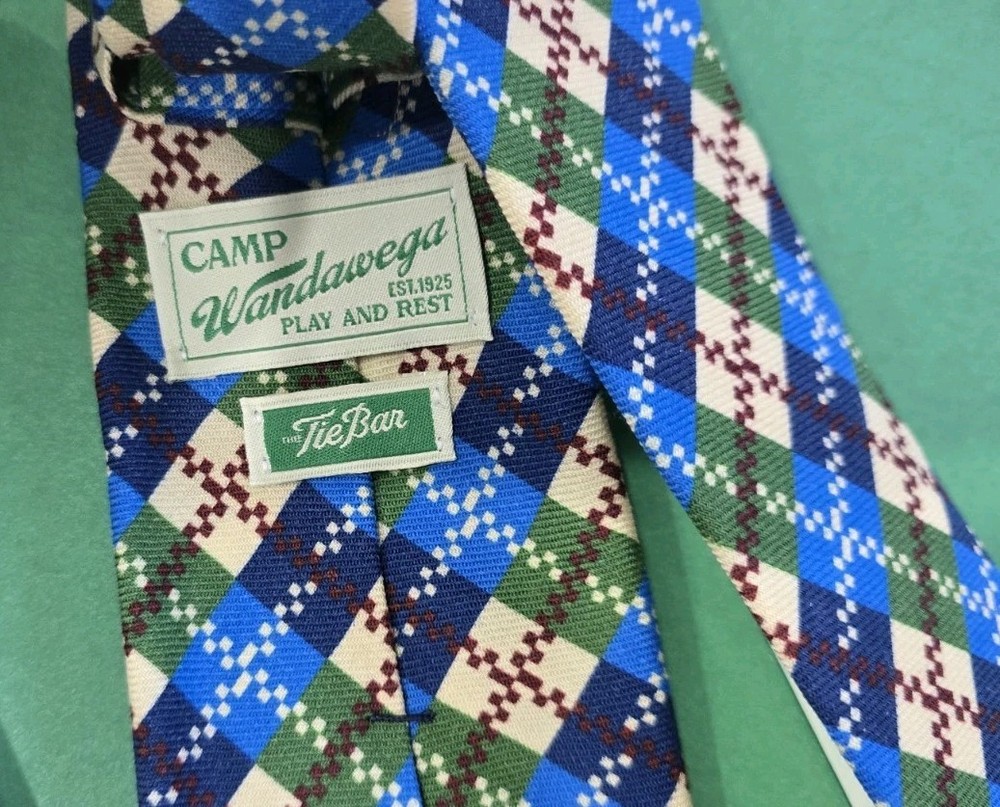 Pattern:Plaids & ChecksNumber of Pieces:1 pieceFeatures:camp wandawega, camp wandawega tie bar, tie bar, made in USA, camp wandawega dive bar, camp wandawega dive bar tie barVintage:NoTheme:Preppy, plaid tie, camp wandawega, camp wandawega tie bar, camp wandawegadive bar tie bar, new tie barDepartment:MenSize:One SizeStyle:DesignerFabric Type:WovenBrand:The Tie BarAccents:argyle tieMaterial:WoolCharacter:camp wandawegaType:TieItem Length:Classic (57"-60")Color:BlueCountry/Region of Manufacture:United StatesHandmade:Yes