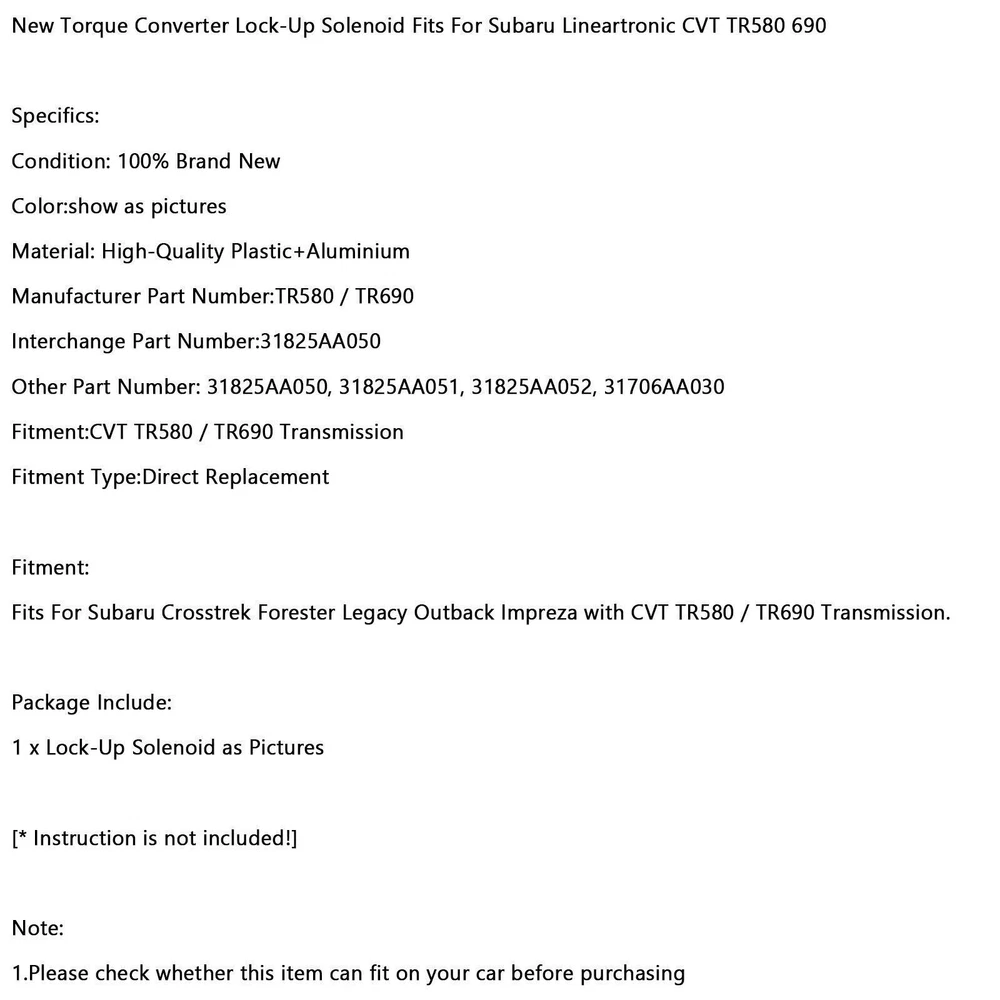 Vacuum Pump DS7G2A451CB For FORD C-MAX S-MAX ESCAPE KUGA MONDEO EcoBoost 1.5L U4 107.99 USD Free shipping Heat/Cool Digital Thermostat Replacement Compatible with Coleman 83303362 Black! 46.65 USD Free shipping Integrated Supply Module 12638645514 for BMW X3 X4 X5 X6 xDrive28i xDrive35i 3.0 41.99 USD Free shipping Rear Blind Spot Radar Monitor Sensor 88162-08060 For Toyota Sienna 2021-2023 173.79 USD Free shipping Pedal Repair Pivot Bracket for Cable Operated Clutch for Chevrolet Spark 56.79 USD Free shipping EV Charger Cable Holder EV Charging Cable Hook SAE J1772 Hook + Holder #1 81.99 USD Free shipping SAFE & SECURE SHOPPING 100% SATISFACTION GUARANTEED FAST SHIPPING Store Categories Store Categories Other eBay Motors Grille You may also like 4PCS Fuel Injectors 16010-5PA-305 Fit Honda Accord 2018-20 CR-V 2017-20 1.5L U4 71.65 USD Free shipping Right Rear Tail Fog Light Reflector 8693008 For Volvo XC90 2003-06 38.65 USD Free shipping Left+Right Rear Tail Fog Light Reflector 8693008 8693009 For Volvo XC90 03-06 70.65 USD Free shipping Engine Oil Cooler Line 17227589509 17227589510 Fit BMW 550i 550i GT 550i 650i 337.65 USD Free shipping Air Inlet Intake Manifold 06J133201BD Fit VW Scirocco 137 2008-16 Coupe 2.0 153.65 USD Free shipping 901072 RE0F11A JF015E CVT Transmission Belt Chain For Nissan D1 U4 147.99 USD Free shipping New Torque Converter Lock-Up Solenoid Fits For Lineartronic CVT TR580 690 !! Product Description New Torque Converter Lock-Up Solenoid Fits For Lineartronic CVT TR580 690 Feature: 1: According to the original factory specifications,perfect match for the original car. 2: Own different test machines to design exact accurate parameter for our products.All switches were tested for performance. 3: Made by high quality material, lightweight, anti-rust, colorfast and durable. 4: Aftermarket product with premium quality. 5: Stable performance, high reliability,suitable for replacing your broken one. Specifics: Condition: 100% Brand New Color:show as pictures Material: High-Quality Plastic+Aluminium Manufacturer Part Number:TR580 / TR690 Interchange Part Number:31825AA050 Other Part Number: 31825AA050, 31825AA051, 31825AA052, 31706AA030 Fitment:CVT TR580 / TR690 Transmission ****Current(Brown):10/13.5Ω Fitment Type:Direct Replacement Fitment: Fits For Crosstrek Forester Legacy Outback Impreza with CVT TR580 / TR690 Transmission. Package Include: 1 x Lock-Up Solenoid as Pictures [* Instruction is not included!] Note: 1.Please check whether this item can fit on your car before purchasing About Us Shipping Terms Contact Us About Us Bruce & Shark is a company Focus on Motorcycle parts more than 11 years. The design inspiration comes from the awe of the vast sea and worship of the fighting sharks, therefore Bruce & Shark takes a shark as brand logo. Since its inception, we have always put the "customer first" and "top quality" as our principle. We specialized in selling Motorcycle parts and providing customers with various types of high-quality products. Our brand Bruce & Shark has enjoyed good reputation in America, Europe, Japan, Canada and Africa, covering more than 30 countries. Our vision is to deliver high-quality Motorcycle parts products and sincere services to the world. Our main products are motorcycle mounted, fuel pump, stator, windshield, Seat Cover, motorcycle fairing. Welcome to our shop to choose products that are worth more for your Motorcycle! Please Add me to your list of favorite sellers and visit often. Thank you for your business. Shipping Shipping Terms International Buyers – Please Note: 1. Import duties, taxes and charges are not included in the item price or shipping charges. These charges are the buyer’s responsibility. 2. Please check with your country’s customs office to determine what these additional costs will be prior to bidding/buying. 3.Buyers' Information: We strive our best to provide you the most reliable, affordable way of shipping service. But sometimes international delivery is highly depended on the courier company and local customs/duties. If you do not receive your item on time, please sent us ebay message immediately for further assistance. Thank you for your understanding. Terms We stand behind everything that we sell and will do everything possible to assure you are satisfied. When you receive your purchase if you are not 100% satisfied, please sent me ebay message and we will do our best to make you happy. If you still want to return your purchase, simply ship the item(s) back to us and we will refund your original purchase price and the original shipping charge. Buyers are responsible for the postal cost of returning the items. We must be notified of the intent to return your item within 30 days of receiving the item. Items returned must be in the same condition that they were received. How to return 1,Please ask us for return address . 2,Shipping back the package . The RMA#(Return Merchant Authorization Number = Your ebay ID) must be clearly written on the return package ,Otherwise the package will be refused. 3,Sent us the return tracking number. 4,All returns will be inspected prior to a credit being issued. Contact Us Sent ebay message in English If you have any questions, our Customer Service staffs welcome you to sent me ebay message. We strive to answer all questions and resolve any problems as quickly as possible. Business Hours: HongKong Time GMT+8:00 Monday-Saturday 9:00-17:00 Copyright © 2022 Tongtool