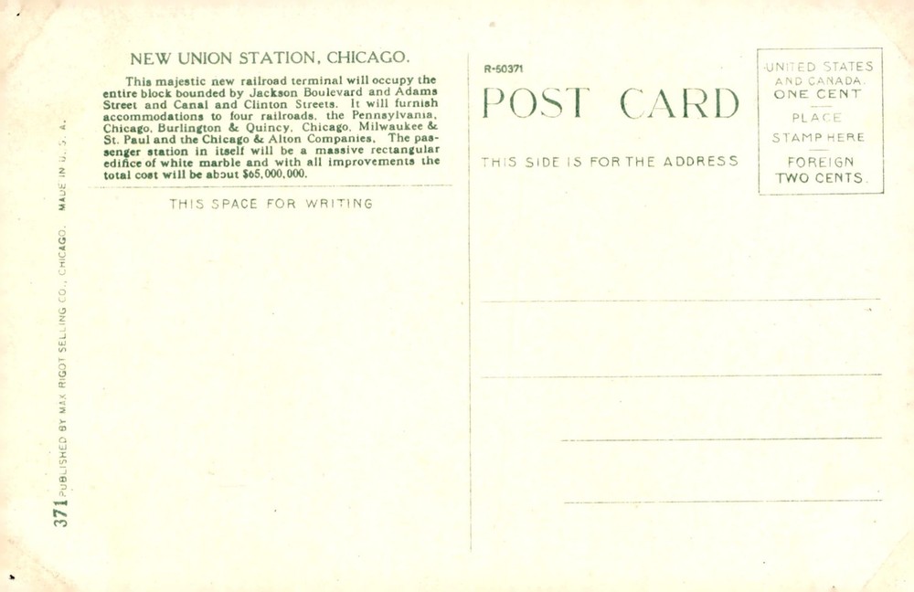 New Union Station in Chicago, a majestic railroad terminal occupying an entire city block, serving four major railroads with a total cost of $65 million.