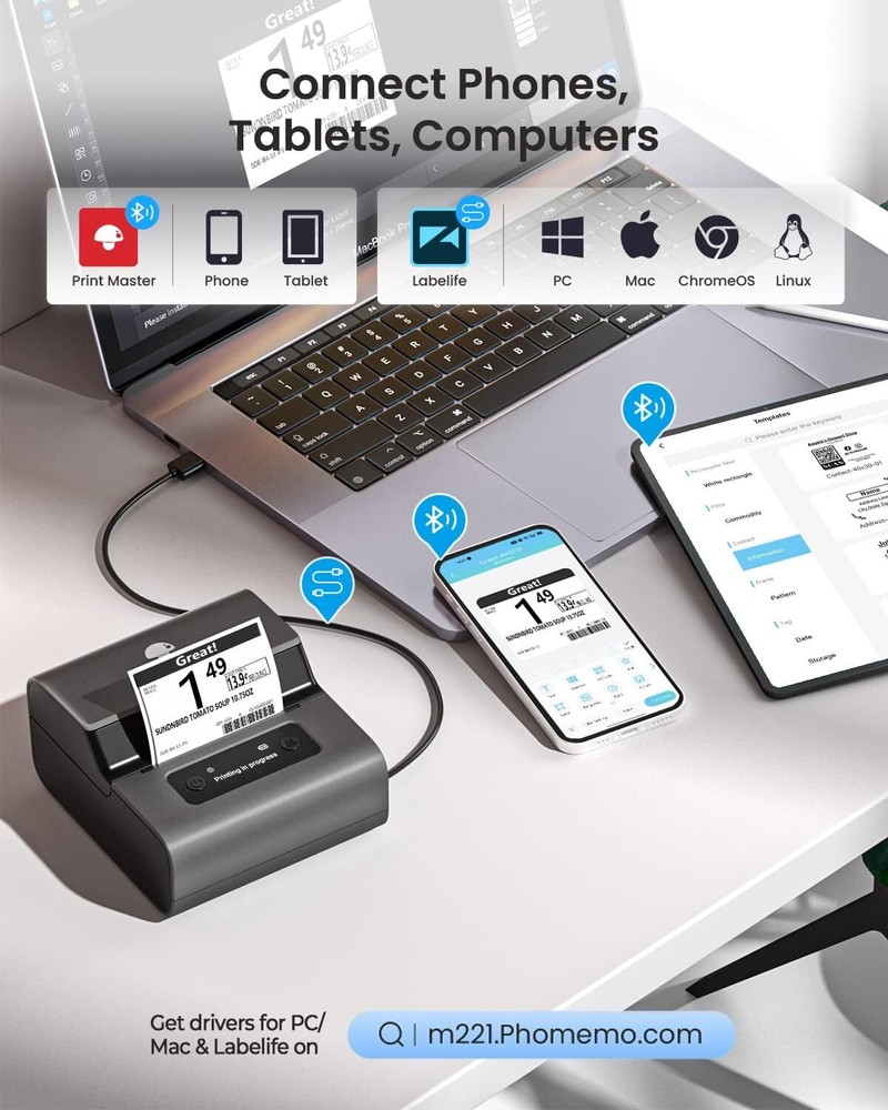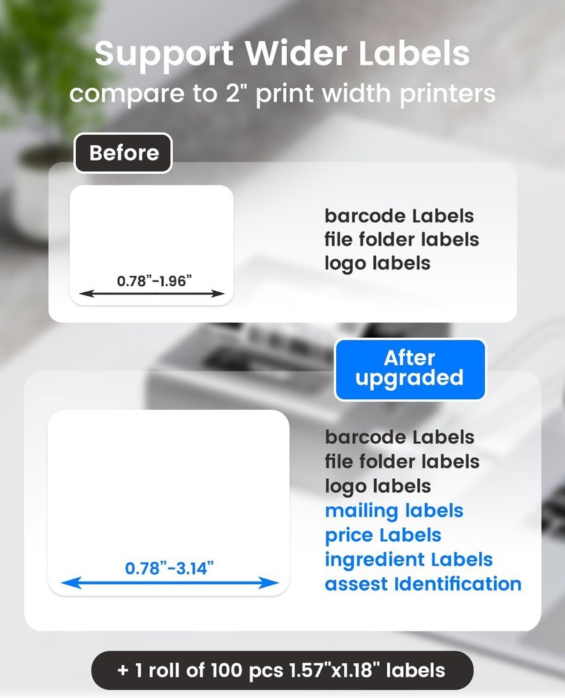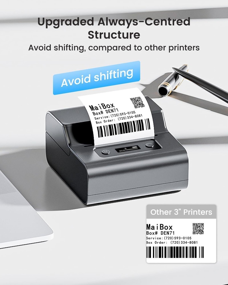 About this item 3-INCH PRINT WIDTH: This Bluetooth label printer offers a wide printing width of 0.78’’-3.14’’ (20-80 mm) and works with over 50 types of thermal labels (no ink or toner), designed for versatile scenarios. It easily creates barcode, QR code, address, clothing, product, cable, jewelry, and folder labels, ideal for small business, office, and home use. NEW NON-SLIP PADS FOR STABILITY: Featuring non-slip pads, this thermal label maker provides a more stable printing experience on desktop surfaces while maintaining portability. IMPROVED PRINT CLARITY: Upgraded internal structure delivers smoother and clearer thermal printing compared to previous models. EASY LABEL LOADING: The integrated label roll installation design eliminates complicated assembly. Simply insert the label roll and secure it with the side baffles for hassle-free loading. ACCURATE PRINT ALIGNMENT: Enhanced print head precision and an improved integrated label fixer keep the label roll centered, reducing print offsets and ensuring consistent results. ZERO GAP PRINTING DELAY: Advanced label recognition allows immediate printing of the next label without waiting, greatly improving efficiency. QUIET OPERATION: Upgraded print head reduces noise and fluctuations by 50%, making this model perfect for environments requiring low noise levels. COMPATIBLE WITH PHONES, TABLETS & COMPUTERS: Equipped with stable Bluetooth 4.2 for quick connection to phones and tablets, with USB support for macOS and Windows computers. POWERFUL AND EASY-TO-USE APP: Compatible with an app offering 100+ free label templates in 13 languages. Print text, barcodes, QR codes, icons, pictures, stickers, and forms, with batch printing and customizable label options. LARGE CAPACITY & FAST CHARGING: Supports printing up to 3600 labels on a single full charge with convenient Type-C fast charging and a portable design for on-the-go use. Product dimensions: 2.57 x 4.93 x 4.52 inches