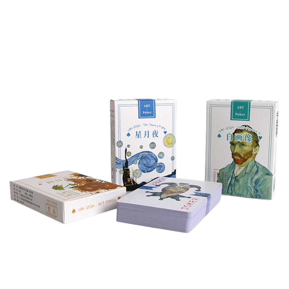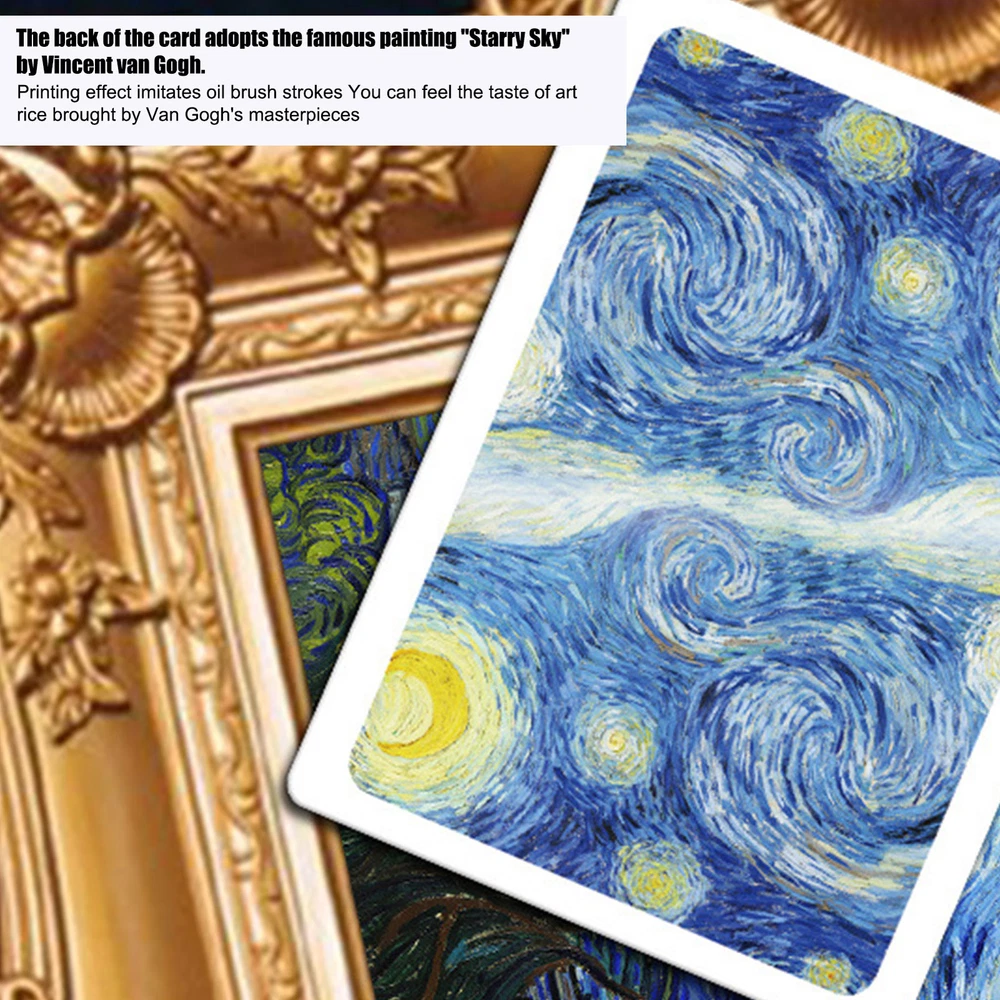 Bullet Points: Description: Made of superior material, and high-quality blue core paper, the card is anti-crease and more resistant to bending. Make you feel extremely comfortable and smooth. Bronzing technology to the brand box improves the overall appearance of the texture. Imitate ink stroke effect to increase the artistic effect of detail processing. Product Attributes: Name: Van Gogh Art Poker Material: paper products Package size: 90MM x 65MM / 3.5*2.6in Card size: 62MM x 87MM / 2.4*3.4in Packing List: 1*Van Gogh Art Poker