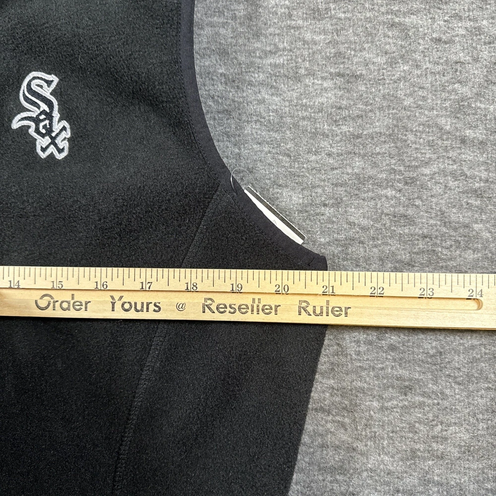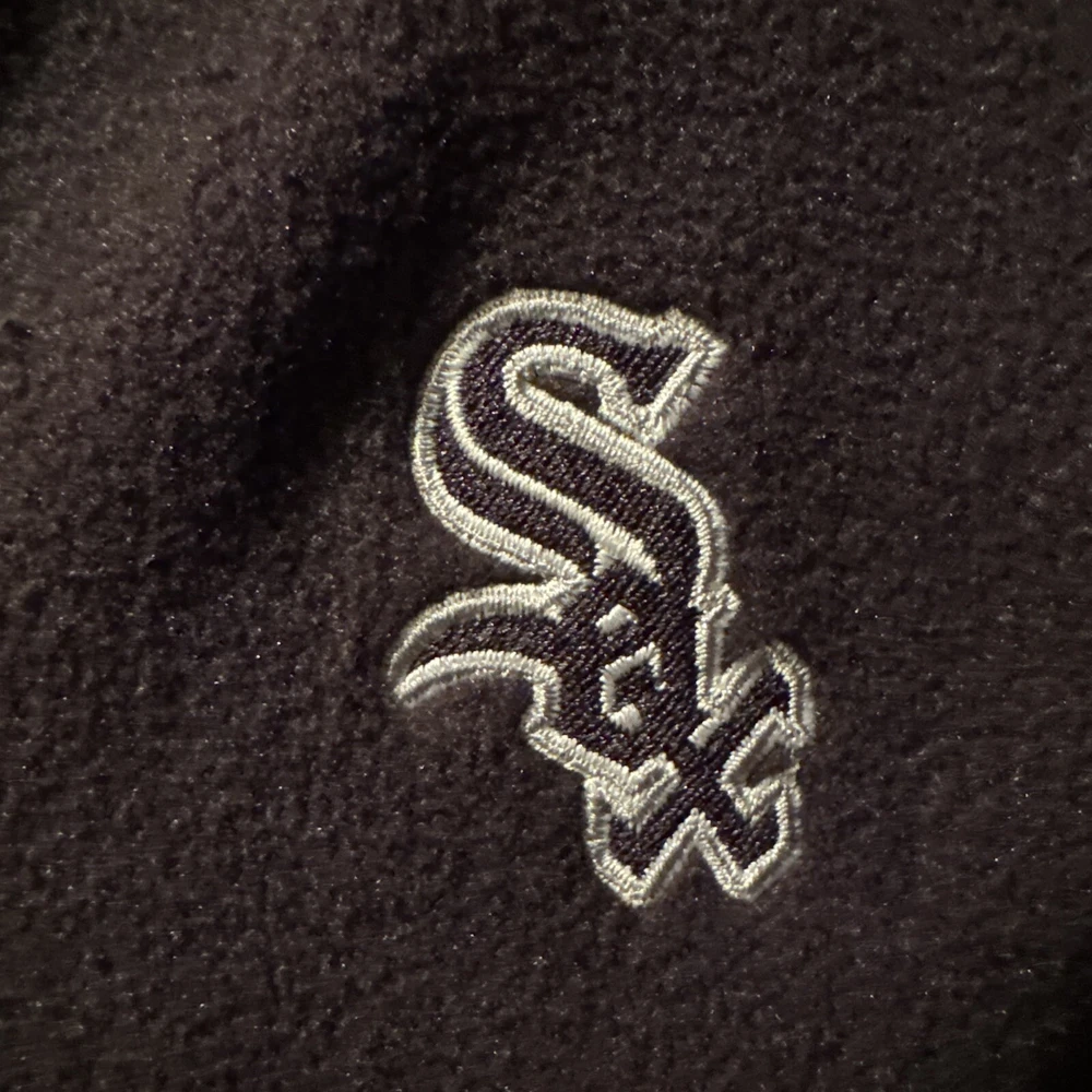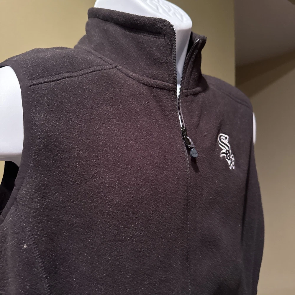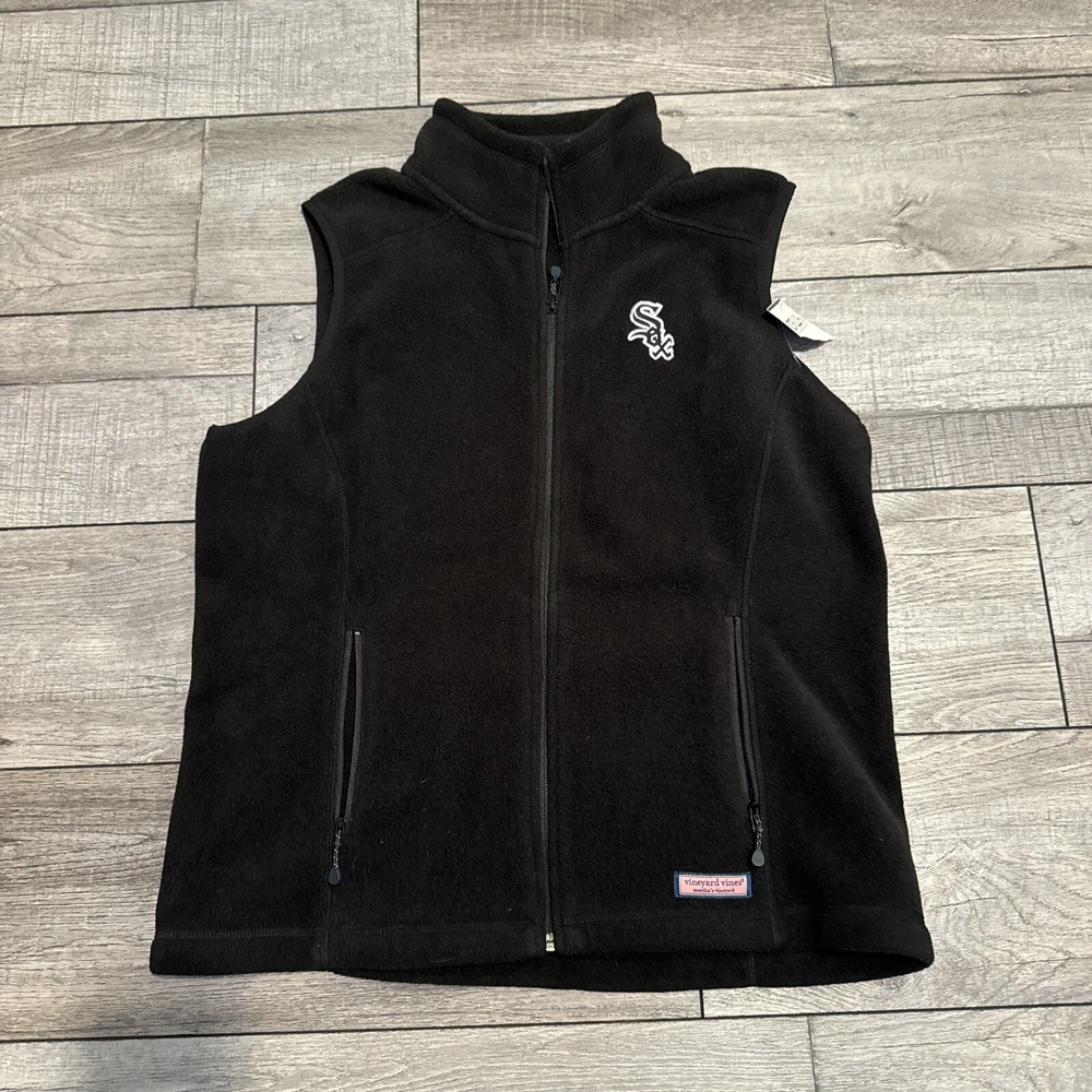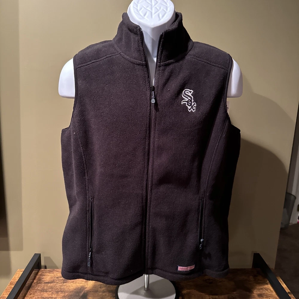 This Vineyard Vines fleece vest is a must-have for any Chicago White Sox fan. Made from durable polyester with a soft fleece fabric type, this black vest is perfect for layering in cooler weather. It features a full zipper closure and the iconic White Sox logo embroidered on the chest. The size is medium and the fit is regular for men. Whether you're at the game or out and about, this stylish vest is the perfect addition to any outfit.