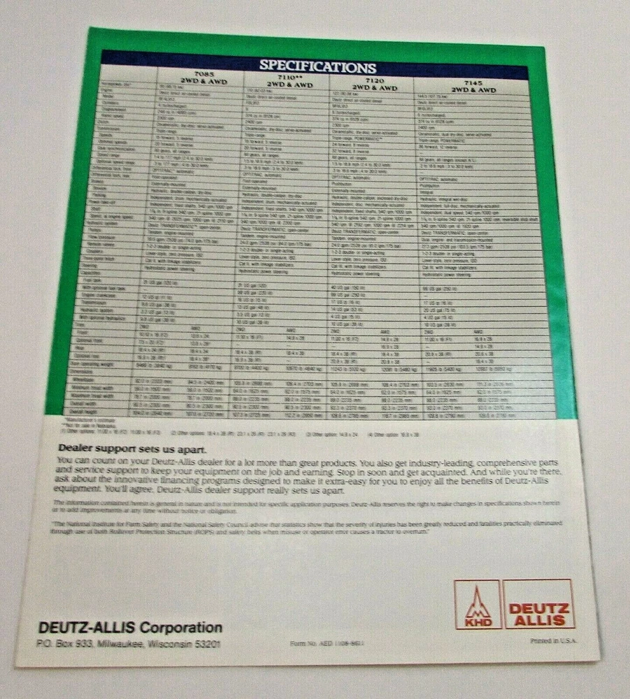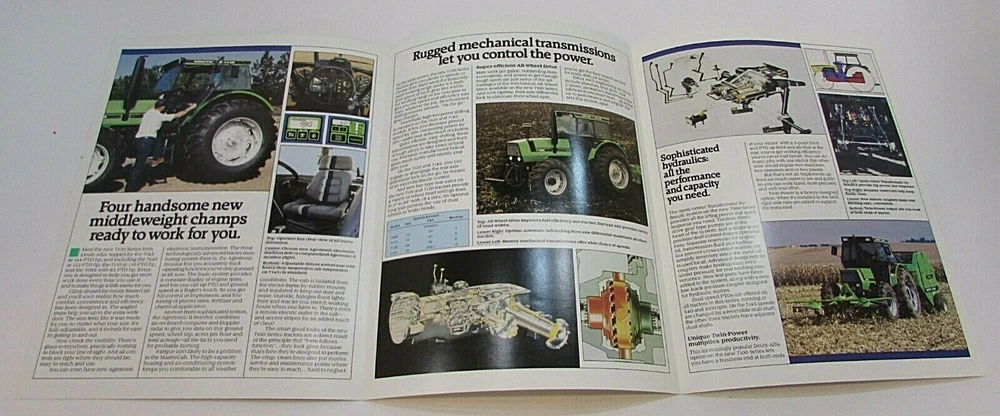 This vintage Deutz Allis tractor brochure from the 1980's showcases the 7085, 7110, 7120, and 7145 models in a colorful and informative tri-fold layout. The brochure provides details on the tractors' features, including their power, capacity, and special attachments. It also includes fascinating facts about the tractors' history and production. The brochure is an original, not a reproduction, and has been well-preserved over the years. It's a must-have for any collector of vintage agricultural advertising and a great addition to any Allis Chalmers or tractor memorabilia collection. New 1986-1990 brochure. DEUTZ ALLIS 7085 / 7110 / 7120 / 7145 AIR COOLED DIESEL TRACTORS 8-1/2" x 11" tri-fold brochure In new 35+ year old excellent vintage condition. No tears/holes/stains/creases/writing/wear. Free s/h Contact me via eBay's message system with any questions before you bid. Thank you for viewing my auctions and store items.