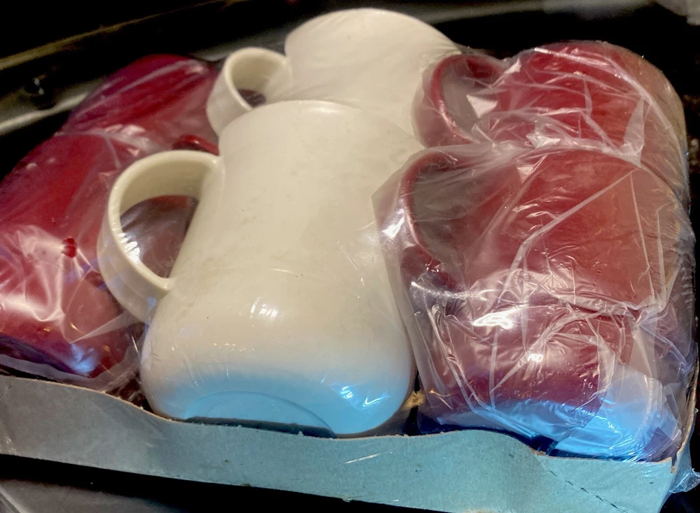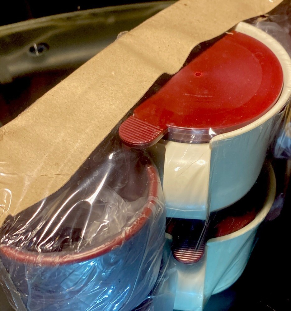 New USA Vintage Tupperware Coffee Serve Set 4 Mugs & 2 Condiment Caddy’s /factory sealed packaging. NOS Made in USA “Out of Production” Collectible Tupperware. Rare Color matching Set