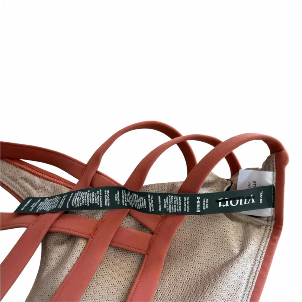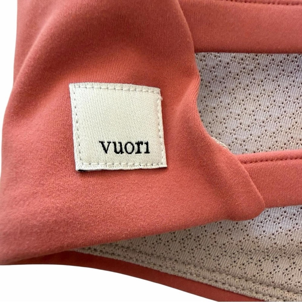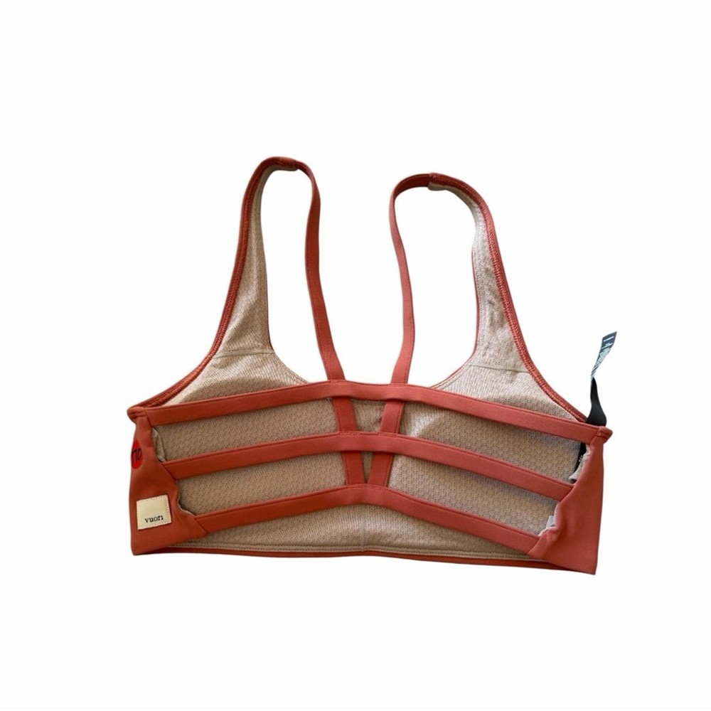 The Vuori Yosemite Bra is soon to become your favorite sports bra ever! It is incredibly versatile and supportive. Size XS Never worn, never washed Crispy size tag (marked to prevent in store returns) Beautiful cinnamon color - so flattering! -Breathe Interlock ™ fabric is peachy to the touch, with smoothing coverage and an airbrushed finish -Light support, perfect for low impact activities -Lined -Removable cups -Moisture-wicking material -72% Polyester, 28% Elastane