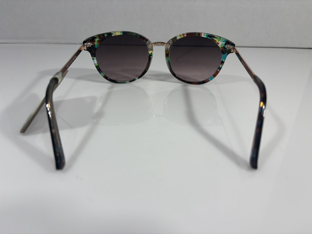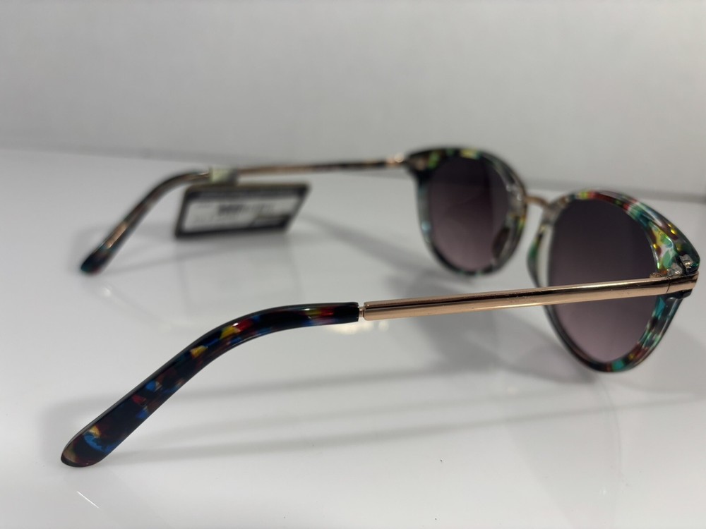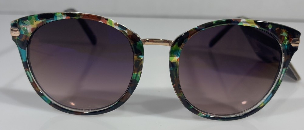 Elevate your fashion game with these stunning Panama Jack sunglasses. The gold plastic frame is adorned with a clear marble pattern in green, brown, and yellow hues, giving it a unique and designer look. The purple mirrored lenses provide 100% UVA/UVB protection, making them both fashionable and functional. These sunglasses are perfect for women who love to make a statement with their accessories. The confetti-themed design adds a touch of playfulness to any outfit, while the polycarbonate lens material ensures durability and longevity. Wear these sunglasses to any occasion and effortlessly turn heads.