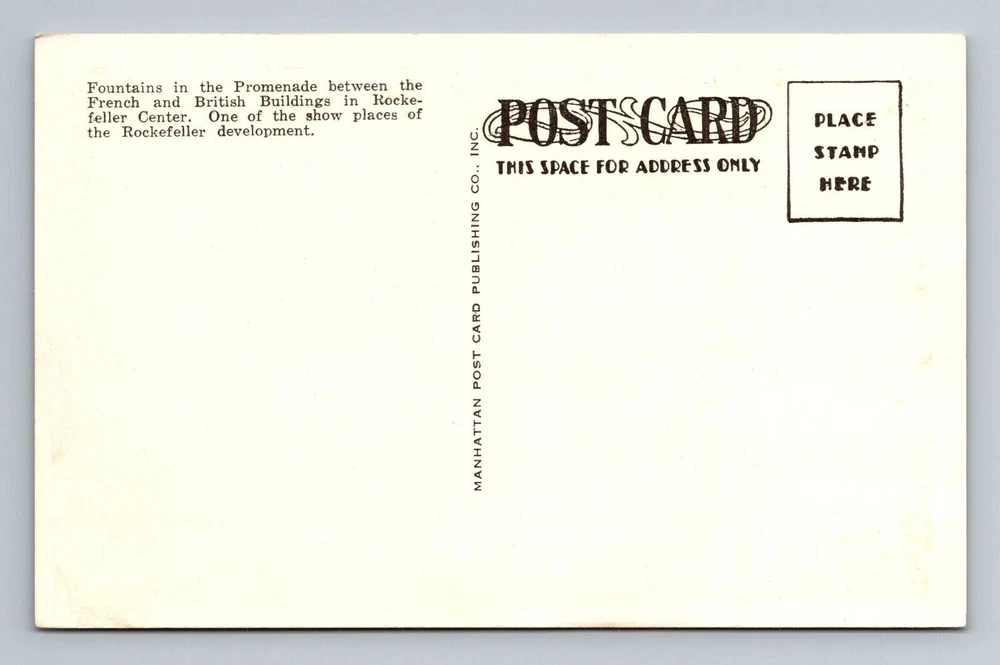New York City NY,, Fountain, Rockefeller Center Vintage Souvenir Postcard