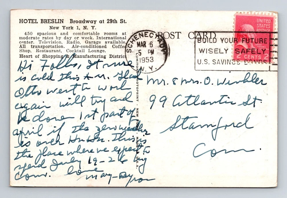 New York City NY, Hotel Breslin, Souvenir, Antique, Vintage c1953 Postcard