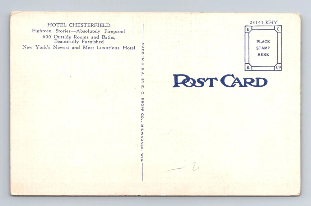New York City NY, Hotel Chesterfield, Souvenir, Antique, Vintage Postcard