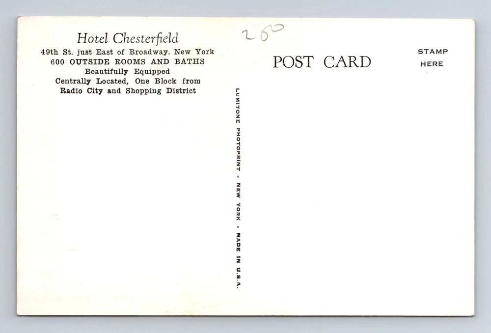 New York City NY, Hotel Chesterfield, Souvenir, Antique, Vintage Postcard