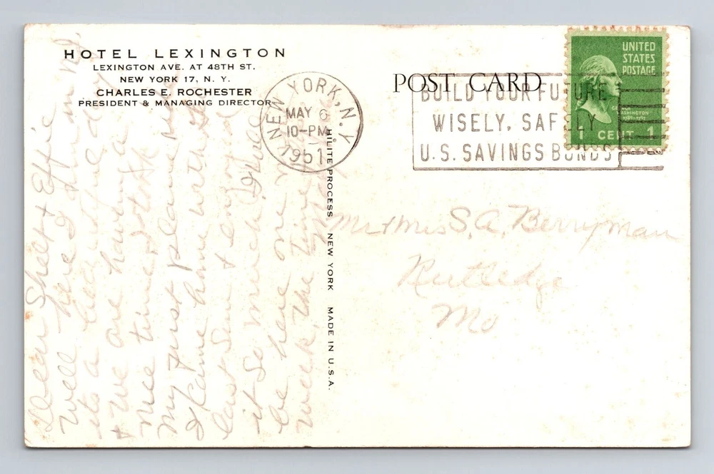 New York City NY, Hotel Lexington, Souvenir, Antique Vintage c1951 Postcard