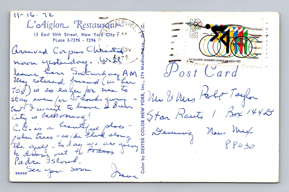 New York City NY, L'Aiglon Restaurant, Souvenir, Vintage c1972 Postcard