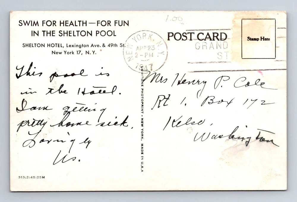 New York City NY, Pool, Shelton Hotel, Souvenir, Vintage c1947 Postcard
