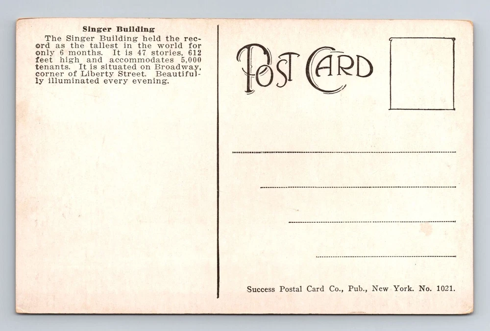 New York City NY, Singer Building, Souvenir, Antique, Vintage Postcard
