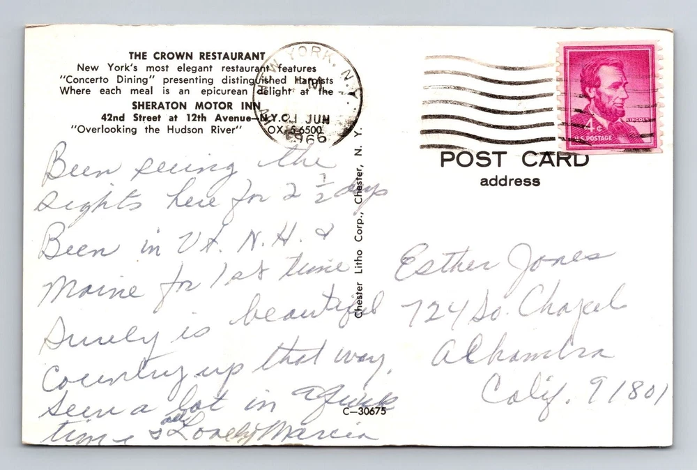 New York City NY, The Crown Restaurant, Souvenir, Vintage c1966 Postcard