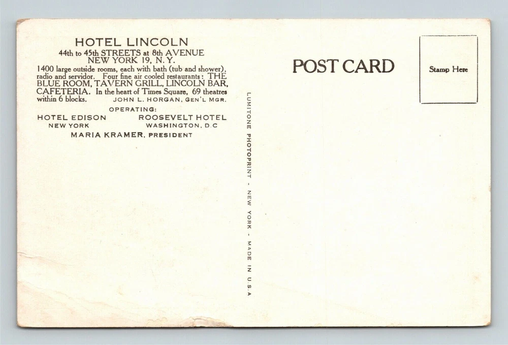 New York City, NY-New York, Hotel Lincoln Vintage Souvenir Postcard
